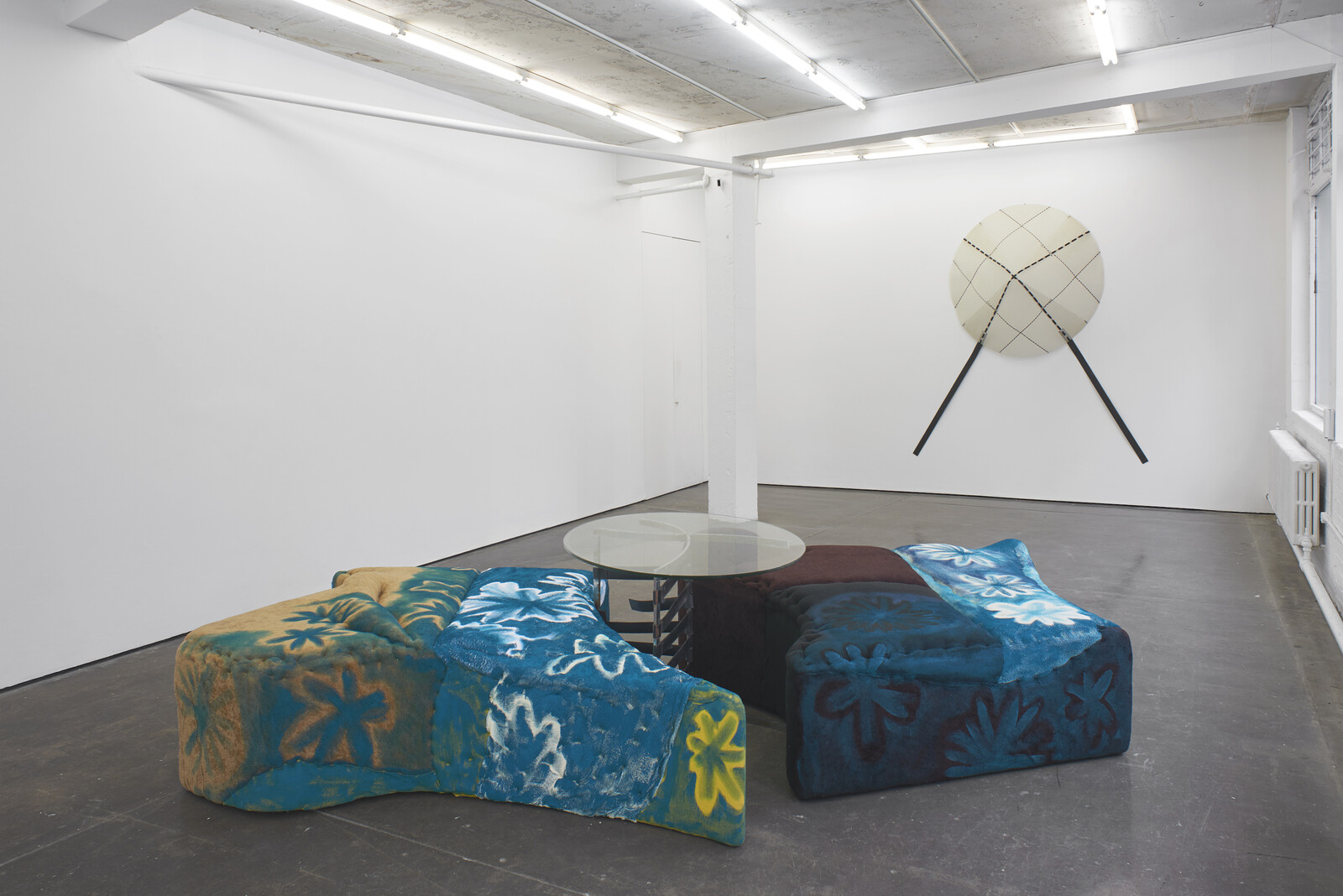 These window views and flower vases recall the home, so inescapable over these past months. Jessi Reaves’s repurposed furniture sculpture Floral ottoman with trapped table (2017–19) at Herald St also affords a glimpse of the private domain. The glass table landlocked between the two large, shabby, hand-painted ottomans looks like it was meant to be fancy, as in a 1980s vision of a New York City loft, but is here rusty and loose. Still, the huge sculpture looks imposing, taking up the entire middle of the sparsely hung gallery, flanked on the two walls behind and in front of it by Ida Ekblad’s abstract painting THE SAND, THE BEER, THE BUTTS, THE GLASS, THE MATCHES, THE SPIT, THE VOMIT (2018) and Diane Simpson’s enamel and steel wall-based sculpture Boshi (1995), which looks like a hat someone forgot hanging on a hook, only huge.