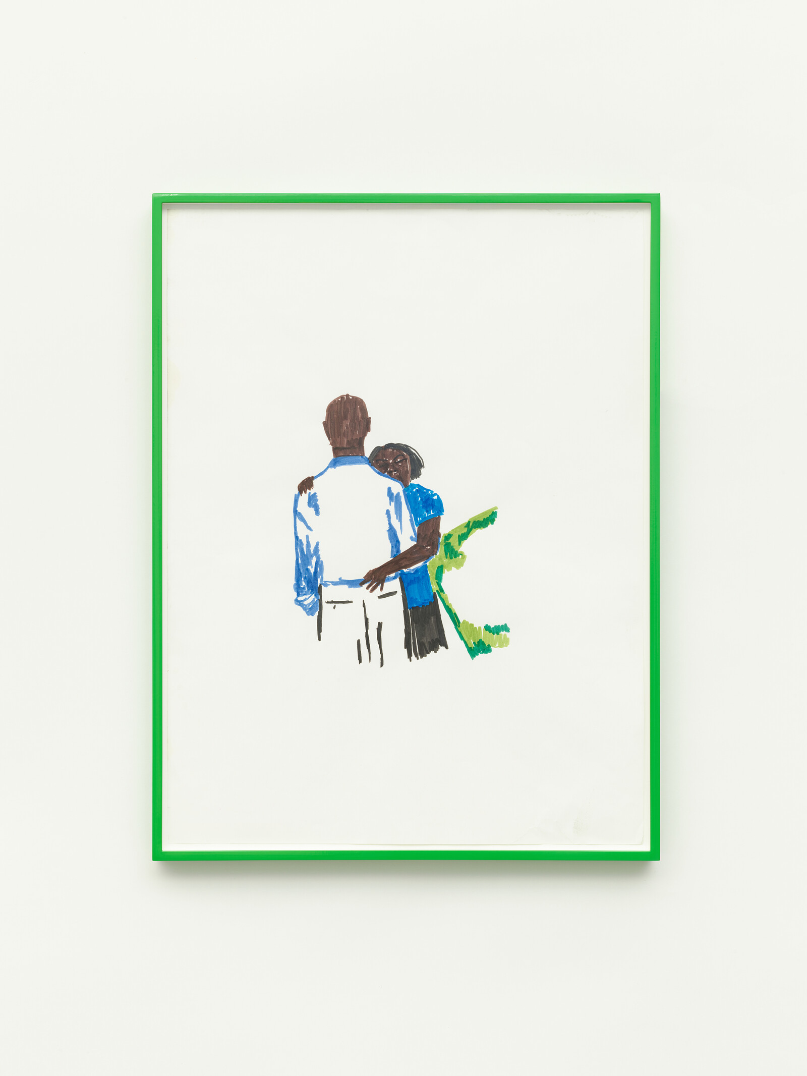 These images of Black joy and intimacy take on extra significance in the context of the continuing Movement for Black Lives. Ifekoya’s insistence on room for dancing and Olulode’s romantic gorgeousness show that space for freedom of creativity and expression matters. I’m reminded of this in front of In It [All], 2021, a small drawing in Martine Syms’s exhibition “SOFT” at Sadie Coles, which shows a couple hugging, with a man visible from the back and a woman holding him, leaning on his shoulder, her eyes closed. The show collects together snippets of daily life in the forms of photographs, drawings, and paintings. Something about the quotidian nature of the images—a kid in the backseat of a car, an apartment full of plants, trips to the beach—feels in line with the artist’s video works. The uniform bright green frames give Syms’s multiple media a coherence reminiscent of the smartphone aesthetic she often employs.