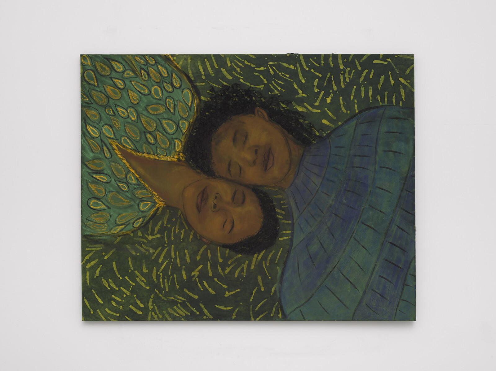 That is not to say that the daily and intimate are not political. At Lisson, “An Infinity of Traces,” a group show curated by Ekow Eshun, focused on the work of UK-based Black artists. It included Alberta Whittle’s video Between a Whisper and a Cry (2019), which explores Barbadian poet and historian Kamau Brathwaite’s idea of an oceanic worldview in the aftermath of the Middle Passage, and a series of watercolor text drawings by Jade Montserrat (who also has a solo show at Bosse & Baum in South London) that bear heavy, physical messages, like The smell of her still burning hair (2017). When I was trying to focus on Evan Ifekoya’s video Disco Breakdown (2014)—in which the dancing figure describes how they should be doing more political things, like joining a picket line, but all they want to do is dance—my eyes kept wandering to three paintings by Sola Olulode showing couples: close, intimate, and sweet. For days after, I show them on my phone to everyone I meet. Look, this is still happening in the world, I proclaim. And by this I mean touch.