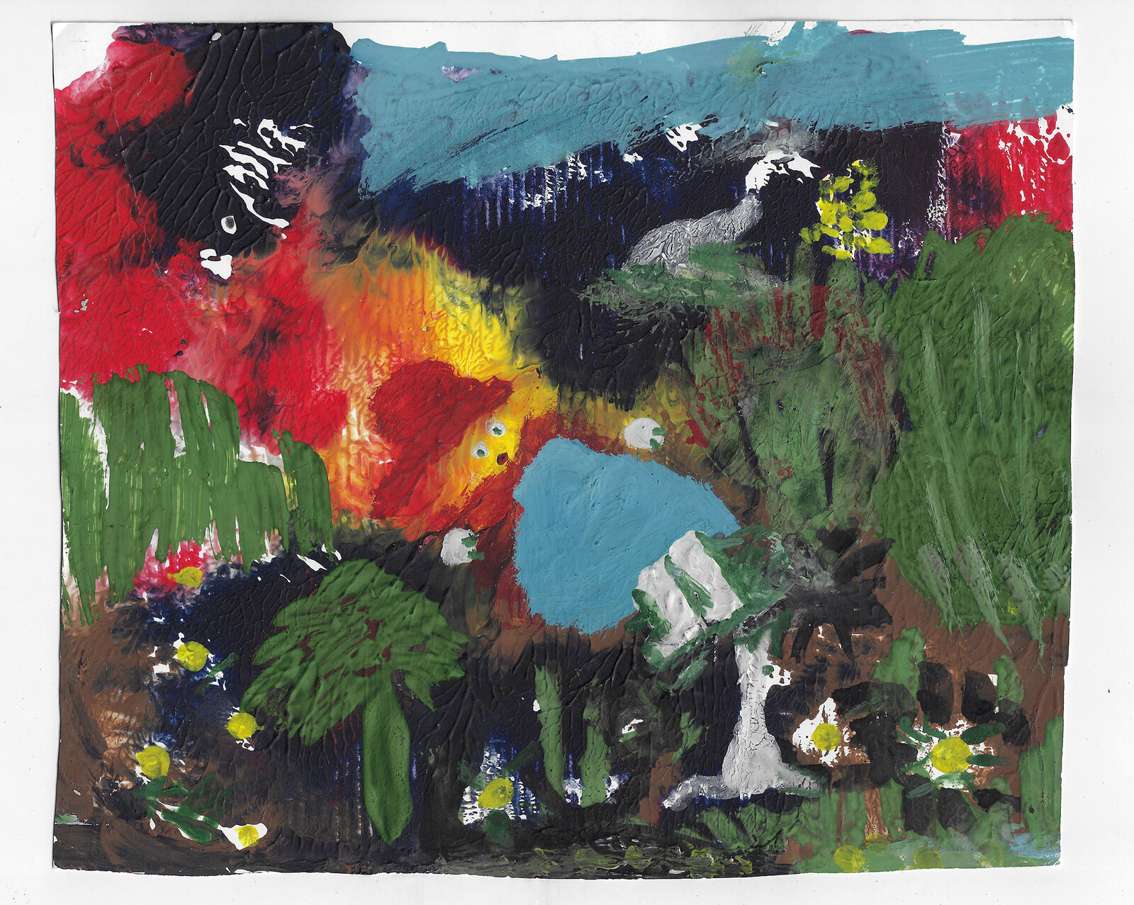 These works differ in many ways from Churchman’s; what they share is a compelling ambivalence. It’s partly a question of style—Chantladze’s expressive marks encompass scratches, splodges, and smears via which figures and surroundings dissolve—and of juxtaposed registers. In Red riding hood (2017) the eponymous figure, here resembling a rag doll, lies tumbled in a marsh. She has a sky-blue skirt and googly eyes, but her head is on fire, flames erupting to the left of the image, black smoke billowing above. While the artist’s imagery is fanciful at first glance, reminiscent of greetings cards or illustrations in children’s books, she also reckons with the darkest periods of her home country’s recent history: the Beslan school siege of 2004, for example, and the Russo-Georgian War of 2008. Working with whatever materials were available to her, Chantladze “tried to find a way out of the situation.”1