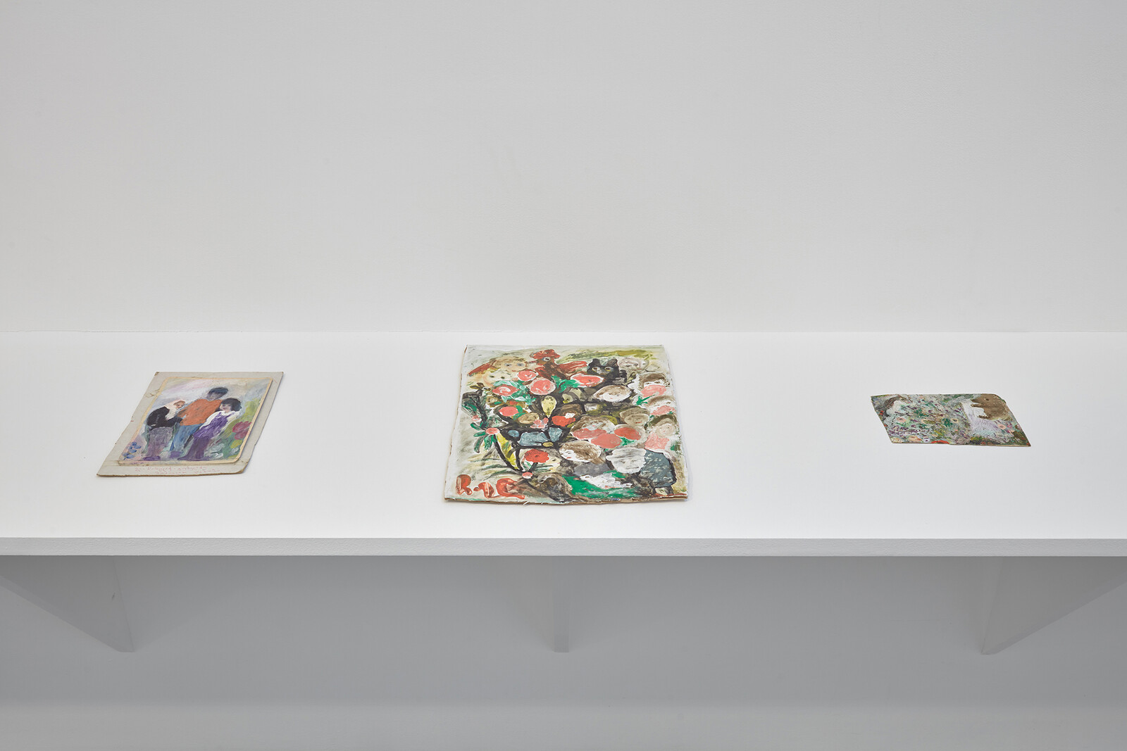 Aran’s impishness contrasted, across town at Modern Art’s Helmet Row outpost, with Elene Chantladze’s misty, dreamlike works on scraps of discarded paper and card, which the artist colored using domestically available materials such as mulberry juice, beets, and cinders, alongside pencil and paint. Growing up on the Black Sea coast of what is now Georgia in the years after World War Two, she learned to paint using her fingers and matchsticks. Comprising new and earlier works (the earliest dates from 1992) displayed on a low shelf running around the edge of the gallery, the works in her first UK exhibition are miniature worlds of subjectivity, in which fictional characters and animals blur in humid rooms and abstract, gaseous clouds of overlapping limbs.