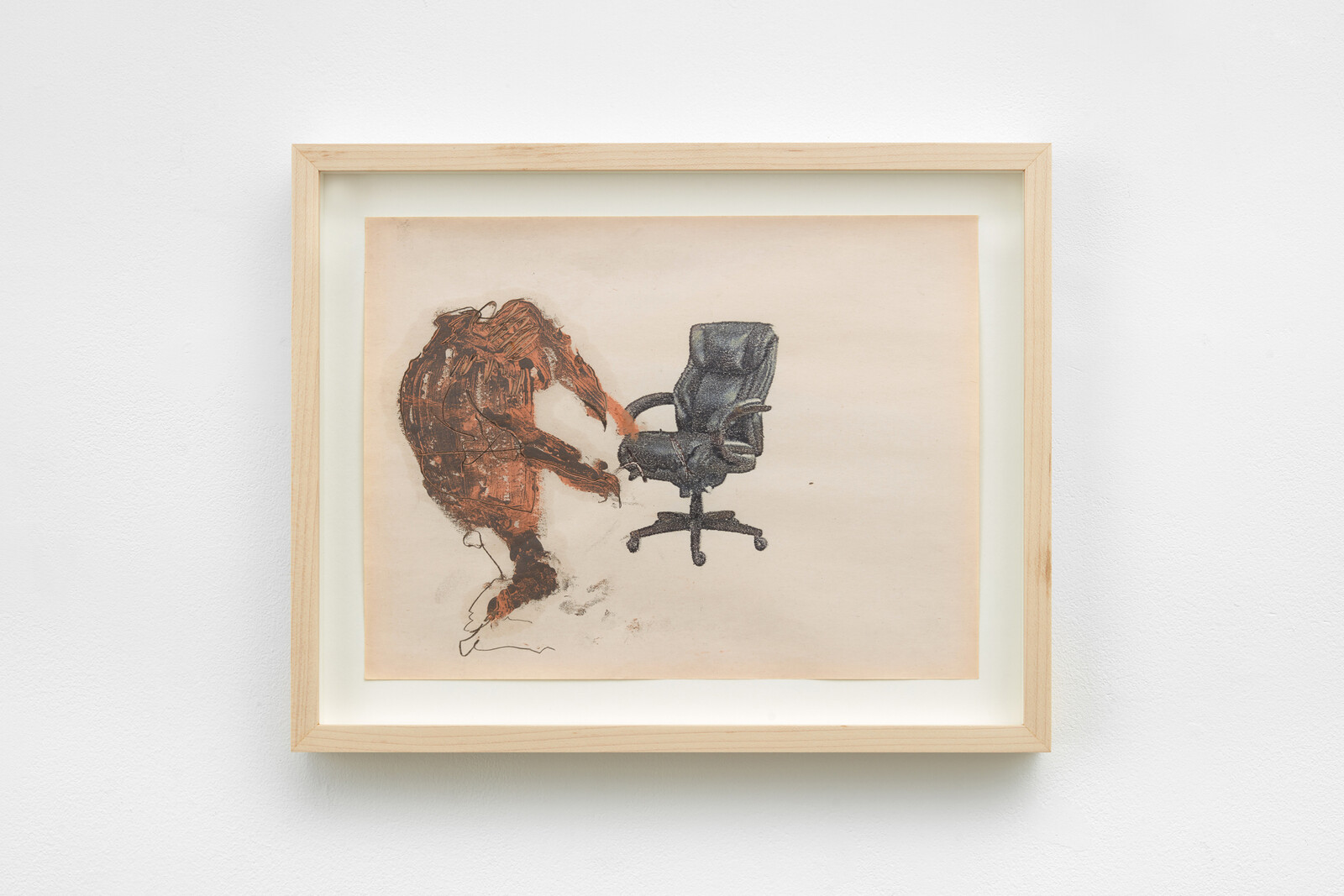 Buildings had emptied out. I passed dusty shop-fronts with Notices of Forfeiture in the windows. Soho’s pubs and restaurants had spilled onto the pavements, the tables crowded. Seeing people socialising outdoors was a reminder of how much of the previous months has been spent not doing that: if you weren’t protesting, you were stewing. Uri Aran’s “Oranges vs Them,” a one-room micro-show at Sadie Coles HQ’s Kingly Street outpost, comprises eight works on paper that read like attempts to form new visual languages while bouncing off the walls, pencil and pastel in hand. In Make Like (2021), a tangerine blur resembling a hunched gargoyle stalks towards an office chair. Working from home for months on end does something to a psyche: I identified with the scratchy timbre of Aran’s work. I felt more than my usual low tolerance of—indeed, a degree of affection for—brattishness here, too. Notes (2020) features no less than four doodled penises. Frustration can be funny, and humor, one hopes, brings some measure of relief.