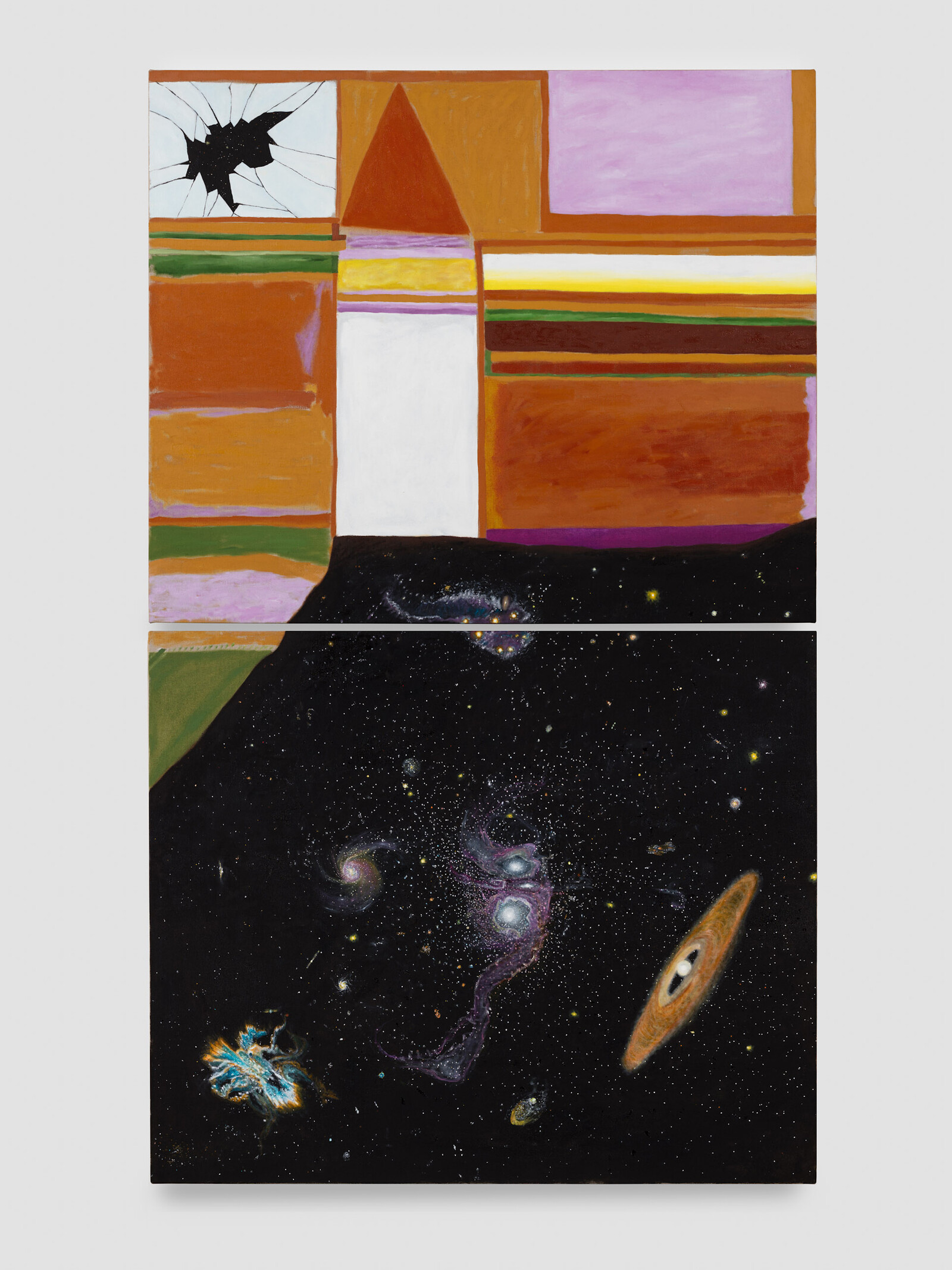 Leidy Churchman’s “The Between is Ringing,” at Rodeo’s Bourdon Street space, is a small, rewarding show of a dozen new paintings that range from smudgy abstraction to cartoonish exuberance. The work subtitled Diptych (all works share a main title with the exhibition and are dated 2020) comprises two oil-on-linen paintings, stacked one atop the other, depicting an abstracted living room that is also an existential void. The walls of this interior, which occupy the upper and left portions of the picture plane, are assembled from soft, Rothko-esque panels of ochre, tangerine, and candy-floss pink inset with bars of moss-green, flax-yellow, and white. Yet where the floor should be is a pictorial trap-door. It opens onto fathomless outer space, nebulae adrift in the twinkling void. A smashed window in the upper left corner suggests that this intrusion of cosmic scale into a domestic setting may be a violent one, but to someone trapped the same image would signal escape. Churchman’s intent may be to suggest that the difference is one of perception.