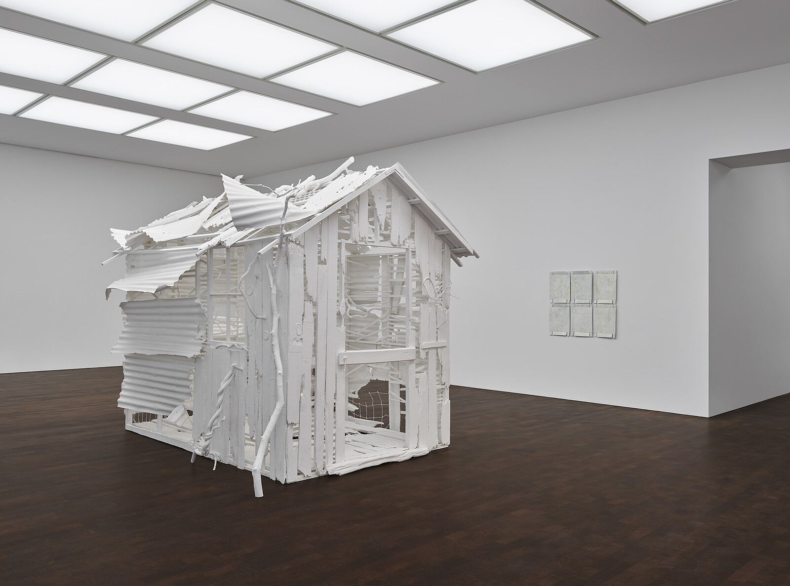 Round the corner from Rodeo is Rachel Whiteread’s “Internal Objects,” at Gagosian’s Grovesnor Hill space. Central to this otherwise low-wattage solo show are a pair of fragile, broken sculptures. Built from salvaged scrap painted a uniform white, the works resemble derelict huts half-demolished by natural forces, the roofs caved in, fallen branches making chicken wire sag, the lids of tin cans stuck like barnacles to the outer walls. Inspired by the American wilderness and made during lockdown, the sledgehammer directness of the works’ titles, Poltergeist (2020) and Doppelgänger (2020–21), contrasts with their material frailty. The sculptures made me feel uneasy, but for reasons other than intended: hard to ignore the reek of gentrification when a ruined dwelling is transformed into a commodity by being brought within the walls of a gallery and beautified with a lick of paint (whitewashed?). The works stood in ironic counterpoint to Whiteread’s House, commissioned by the publicly funded arts organization Artangel: a concrete cast of the inside of a terraced dwelling, which stood exposed to the elements in London’s Mile End for 11 weeks during the winter of 1993 to ’94, at the end of which it was demolished. For a commercial gallery to function it must create spaces of exclusivity, establish barriers to defend against the invasive threat of, if not cosmic interdependence, then at least theft and vandalism. Insecure interiors had begun to seem like a motif of London’s current exhibitions—indeed, of the city itself.