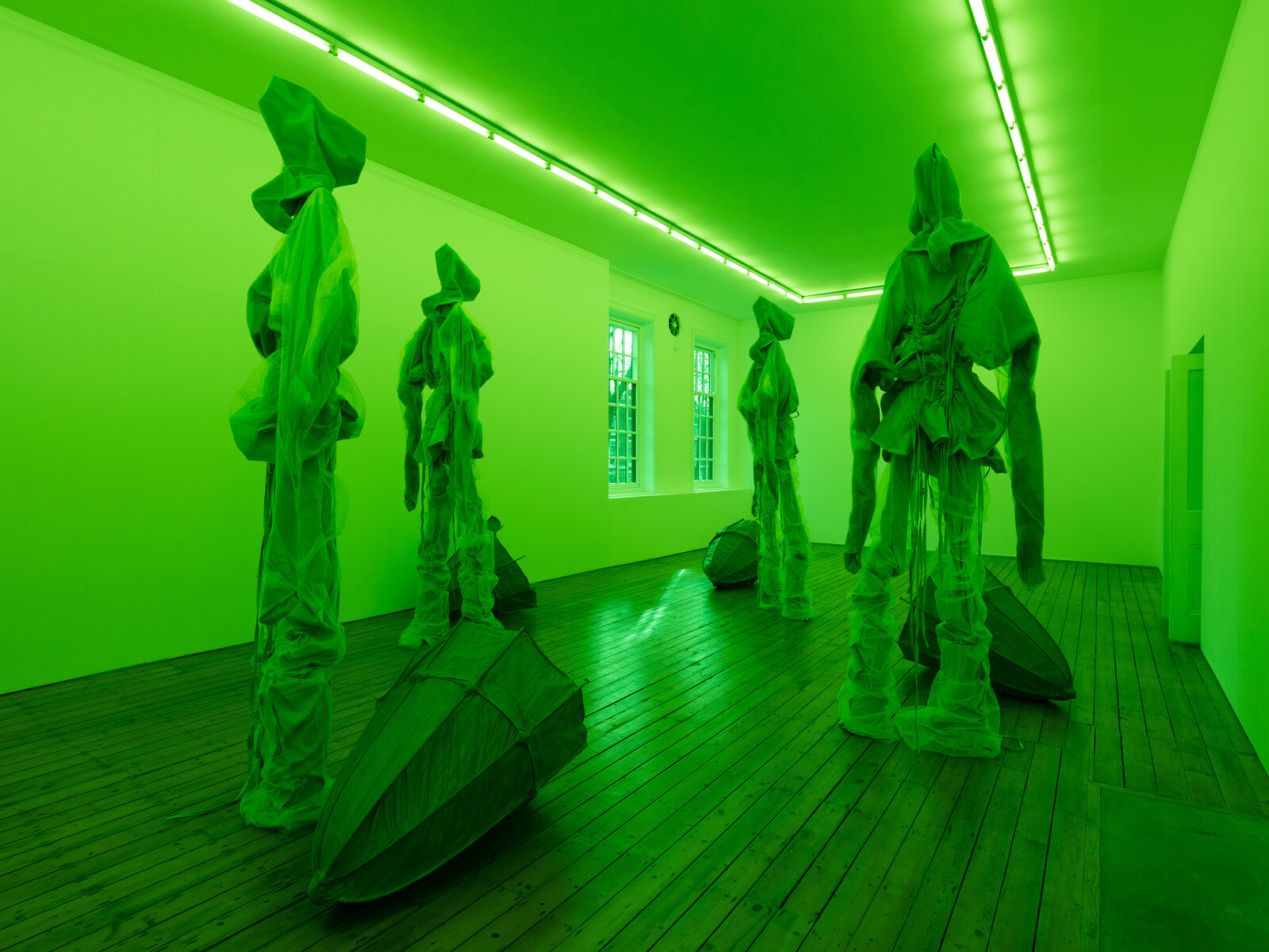 Walking up the stairs to Sandra Mujinga’s “Spectral Keepers” at the Approach, light was leaking under the gallery door, an acid shade I associate with plutonium, horror films, and UFOs. Four thin, looming figures stood in a room flooded green by radiating strip-lights. The sculptures’ long-limbed frames were wreathed and cinched in gray-toned utility gear from which straps dangled, skeletal legs ghosted by translucent tulle. Their heads—modelled on the hoods worn by medieval beekeepers—were faceless, eyeless, mutely staring down. At the feet of each was a cone-shaped basket. Mujinga’s work draws on Afrofuturist writers such as Octavia E. Butler and N. K. Jemisin, and it felt deliberately ambiguous whether these characters are warriors, oracles, or farmers, and from a climate-ravaged planet, a posthuman future, or both. Their cloaks may be religious robes or camouflage, an adaptive response to a world—a hostile glare—that left them dangerously exposed. The screens used as special effects backdrops in movies are green because the shade doesn’t match any natural skin tone or hair color. Far less hospitable, then, had the all-pervasive color been white.