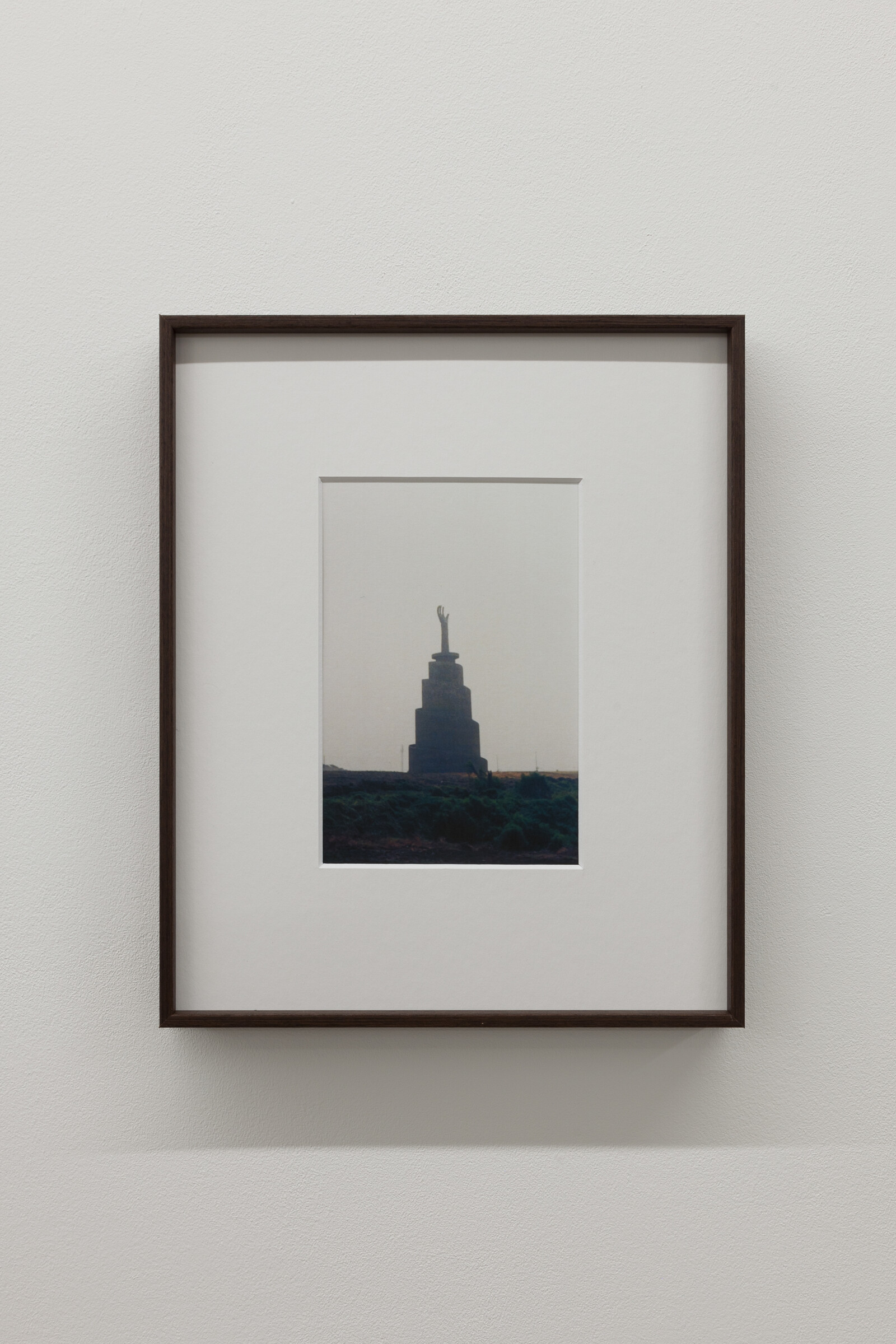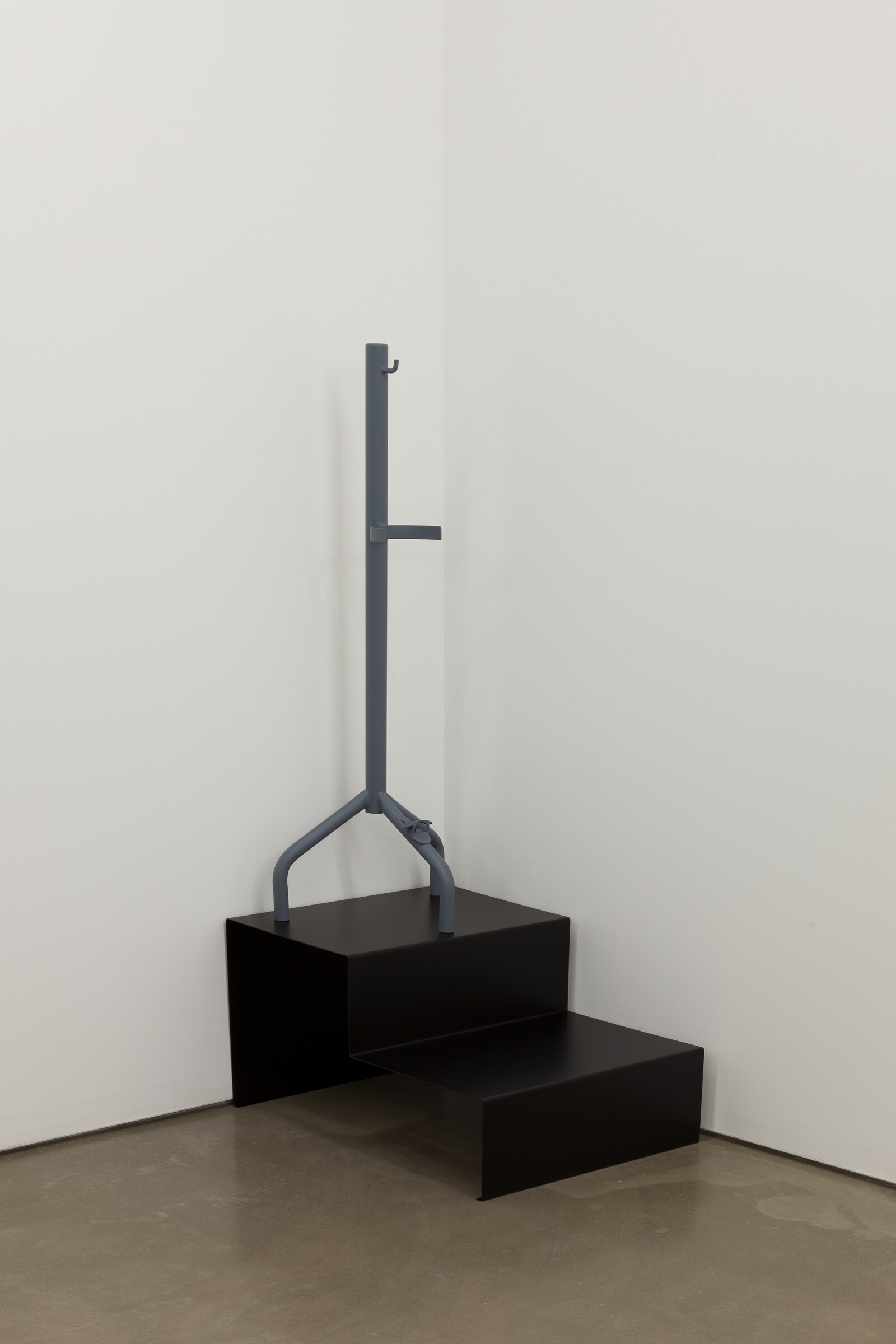 It’s an unlikely benediction: two identical photos frame Dozie Kanu’s exhibition “Owe Deed, One Deep” at Project Native Informant: a small, slightly blurred image of a tower with a hand at the top, reaching awkwardly towards the sky. Emo State (2020) seems to have been taken from a moving car, the landscape around it giving some sense of the sheer scale of the tower, a religious monument modelled on the tower of Babel in southern Nigeria, constructed only a few years ago and torn down in 2019. The ghost of this demolished structure, the two hands waving over the five sculptural assemblages gathered below them, casts the works as their own temporary monuments, momentary markers to whatever spirit or feeling has possessed us, before disappearing. In a corner, St. Jaded Extinguish (2020) is a gray fire extinguisher stand placed forlornly on a flimsy, short set of black stairs, a bottle opener attached to its base that spells out a nihilistic mantra: “SELF SERVE.”