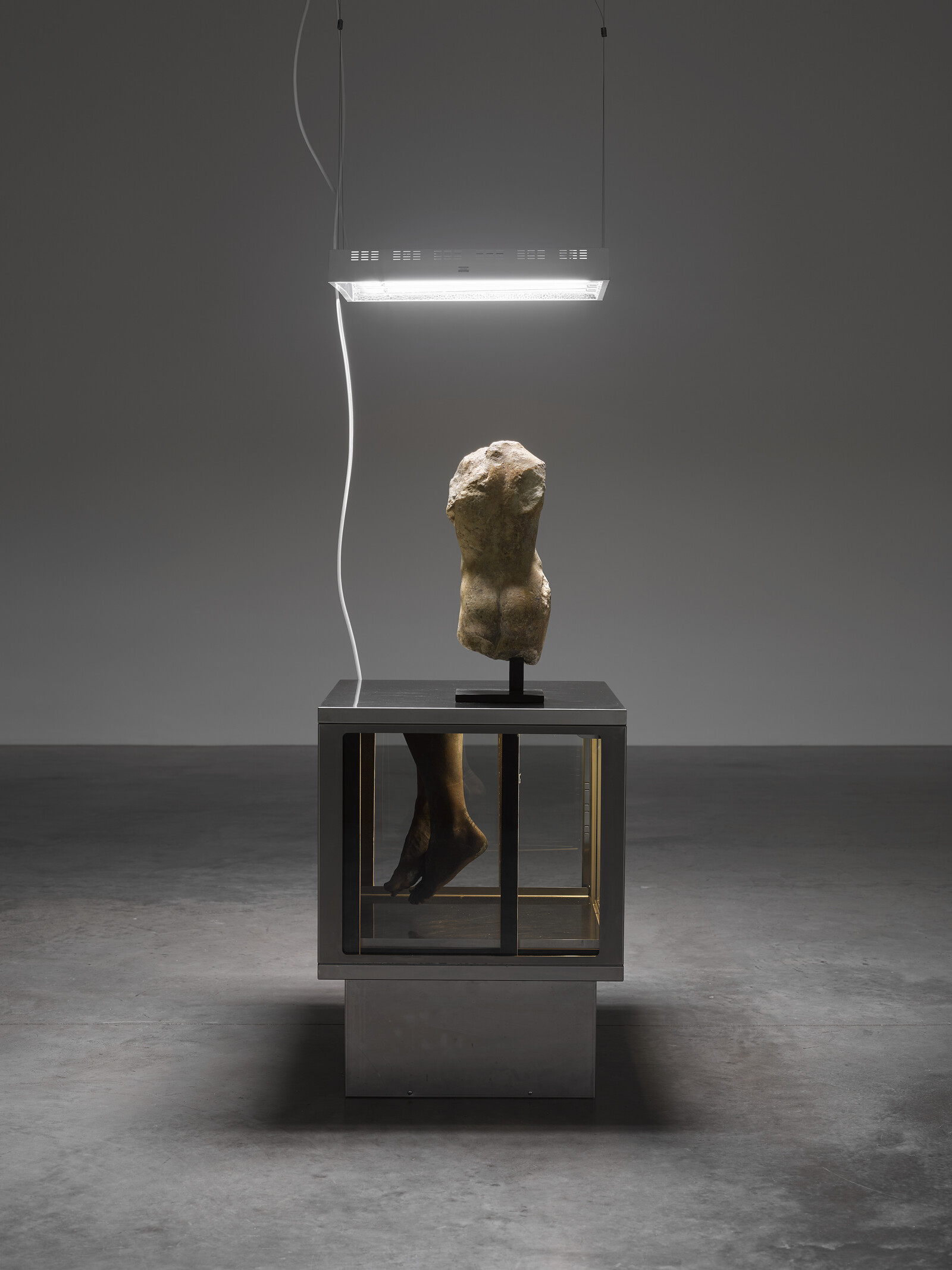 Making my way around exhibitions for the first time since February, it was such slight, haunted gestures that stuck with me. It feels disconcertingly normal to traipse around the city at this time of year, albeit with pre-booking systems, QR–code press releases, and the incessant taste of my facemask. It is, after all, officially Frieze Week, albeit without the tent, but with a virtual edition and a loose cluster of shows to mark a provisional return to IRL. At the back of a vast room in White Cube’s Bermondsey space, dotted with islands of spotlit plants and fragments of Roman sculptures, burlap cloth bulging with soil and wild flowers, marble feet trailed with nasturtium vines, is an uneasy, chimerical corpse. The truncated torso of a decapitated man, its browned marble surface pockmarked and battered, is propped on top of a square refrigeration unit. Hanging down into the fridge are a pair of mottled black-brown feet, as if mummified, the toenails a polished gold; a small fly and a dead moth keep the cooled flesh company. Beauty Queen (2020) is the full stop at the end of Danh Vo’s “Chicxulub,” a presentation of scattered assemblages of ancient and more recent ephemera, at times casually evocative, at others a facile plonking-together. Putting the feet on the torso gestures towards a Dr. Frankenstein-like attempt to connect and reanimate the stone and bronze body parts, but it feels more like witnessing a death.