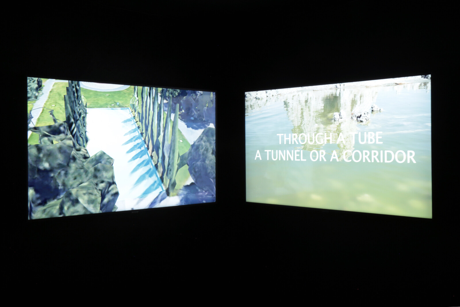 All the Zoom chats and online screenings have, as might already be apparent, made me susceptible to the allure of bald physicality, to sculptural and visceral gestures. At Deptford’s Castor gallery, in a room painted a pale hospital yellow, is a set of Grace Woodcock’s pinkish bacterial blobs made up of silicone and imitation suede. Bolus (2020) is an oval of layered smokey Perspex, interspersed with undulating shapes of suedette that fade into the reflective plastic like rocks disappearing into muddy water. It feels topographical, but also, as the title hints, stands as an elegant reminder that all things turn to shit. Down the road, Solveig Settemsdal’s OK SWALLOW GREAT (2020) is a two-channel video displayed as part of a two-person show with Andrew Sunderland at Gossamer Fog. The screens are set against each other in a corner, depicting on one side what looks like a water filtration plant and a set of luxury swimming pools, and on the other a murky hot water spring, the rocks crusted in limescale and salts. The two videos are unsynched, running in various overlapping configurations over eight minutes, the combined images and text together offering a short meditation on touch and asking “where do we meet.” “We overlap, like this,” words declare across one screen, as water laps gently at a craggy rock that just barely breaks the surface. On the adjacent screen, a swimming pool’s blue-tinted surface fizzes with hundreds of tiny ripples. As the text states, “This surface, it’s so far away in time and space it might as well be virtual.” Settemsdal’s short video has an alluring balance of close, obsessive looking with a disaffected, humorous shrug, suggesting that notwithstanding any philosophical wrangling, we’ll just end up back in a primordial soup.