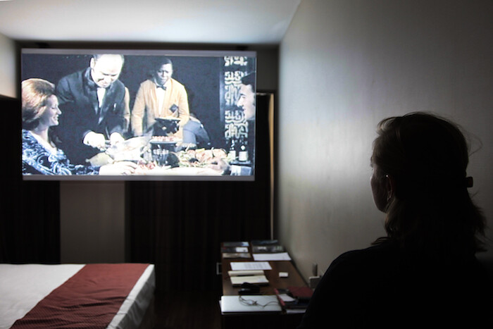 I received the answer at my hotel desk, where I received the exhibition catalogue for “Empathy,” Harun Farocki’s show at the Fundació Antoni Tàpies. The enclosed compliment slip asserts Farocki’s role as a “close collaborator of Loop, whom we would like to pay tribute to,” whilst entreating me to enjoy the fair. By this overt association to a figure paradigmatic for his politically committed film practice, Loop asserts its connection to politically infused discourses of the moving image beyond the market and within the cultural institutions of Barcelona: something that was also apparent in the presence of Malcolm Le Grice and Anthony McCall, both acclaimed for their role in the radical film culture of an earlier period. The hotel is a central venue for Loop. Divested of regular guests, 49 bedrooms similar to the one in which I am staying mutter and flicker, the contours of their bedroom furniture now dimly illuminated by the blue tinted half light of numerous video screens on which commercial art galleries from across Europe, and as far afield as Mexico and Taiwan, present a diversity of moving image works.