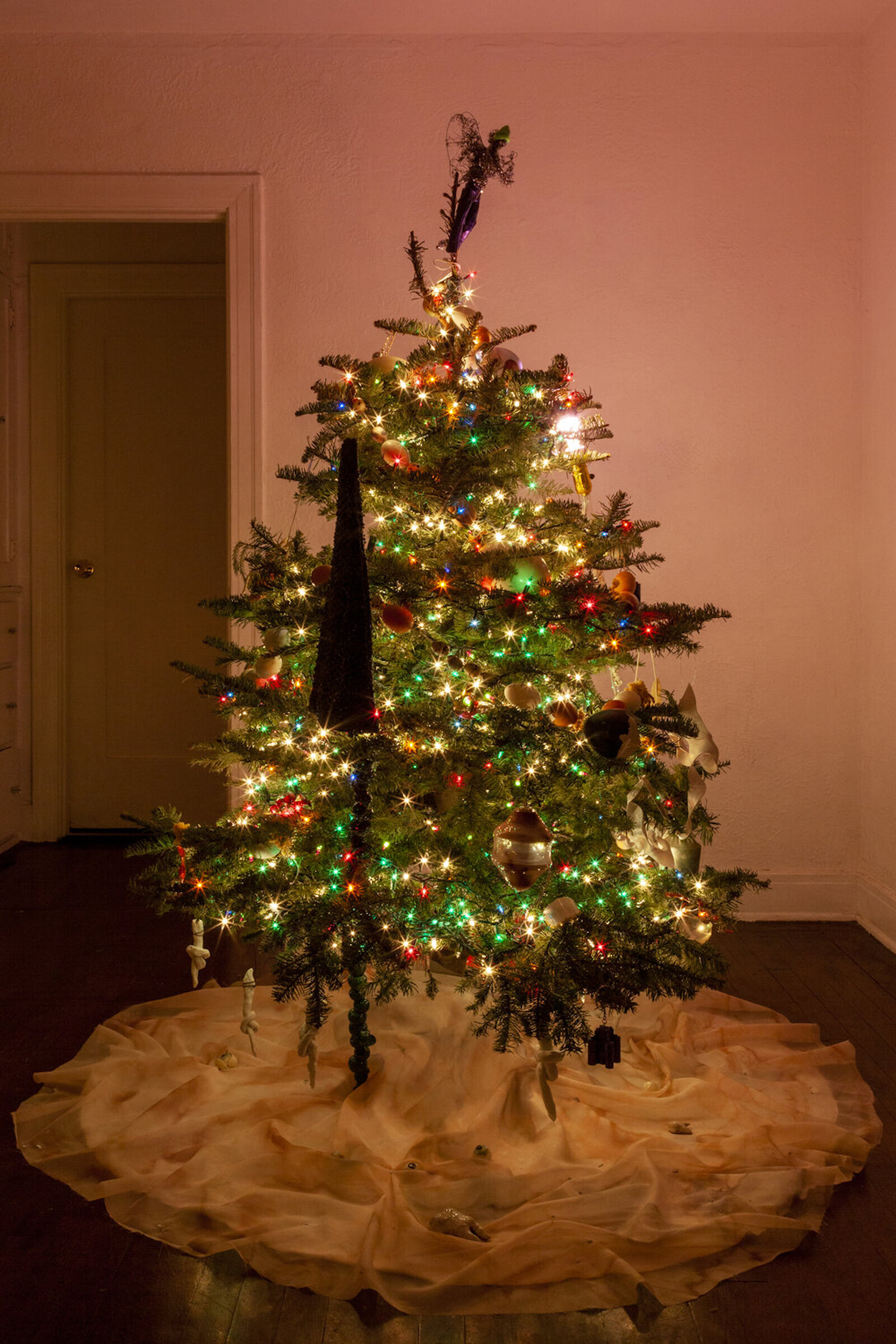 However, there are plenty within the art scene who do understand how to fuck with a themed exhibition’s central premise. This is the case at “From the Xmas Tree of Lucy Bull,” co-organized by the painter and Naoki Sutter-Shudo. Currently in its second iteration in Bull’s living room, the evergreen offers a festive critique of group shows, as artists are invited to decorate its boughs with bespoke ornaments. Immediately, questions arise. Who gets to make the star? (Mathis Altmann’s tie-dye scarecrow tee, untitled, 2020.) Who’s the tinsel? (Matt Copson’s Squid Loop, 2020.) How much branch do you get? (A formidable amount, in the case of Clémentine Adou’s mall-goth spikes, Pics, 2020.) What is made when responding to an object, rather than an idea? Ornaments range from a baroque, pearl-like toe by Eric Veit (Toe For Tree, 2020) to flying bats by Sarah McMenimen (Lovers, 2020) and a snail-infested internet bistro by Michael Zahn (Slime Café, 2020). There’s a certain pleasure in an off-season Christmas show, because at the heart of the proposition is a desire not only to keep the festivities going, but to keep their narratives in constant flux. As Tim Dlugos writes, in his 1985 poem “Pretty Convincing,” “the corpses change but the party goes on forever.”