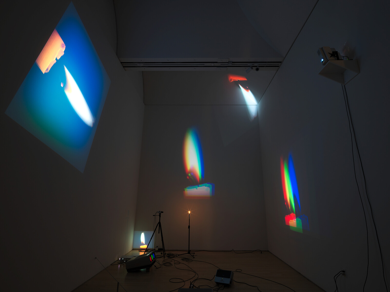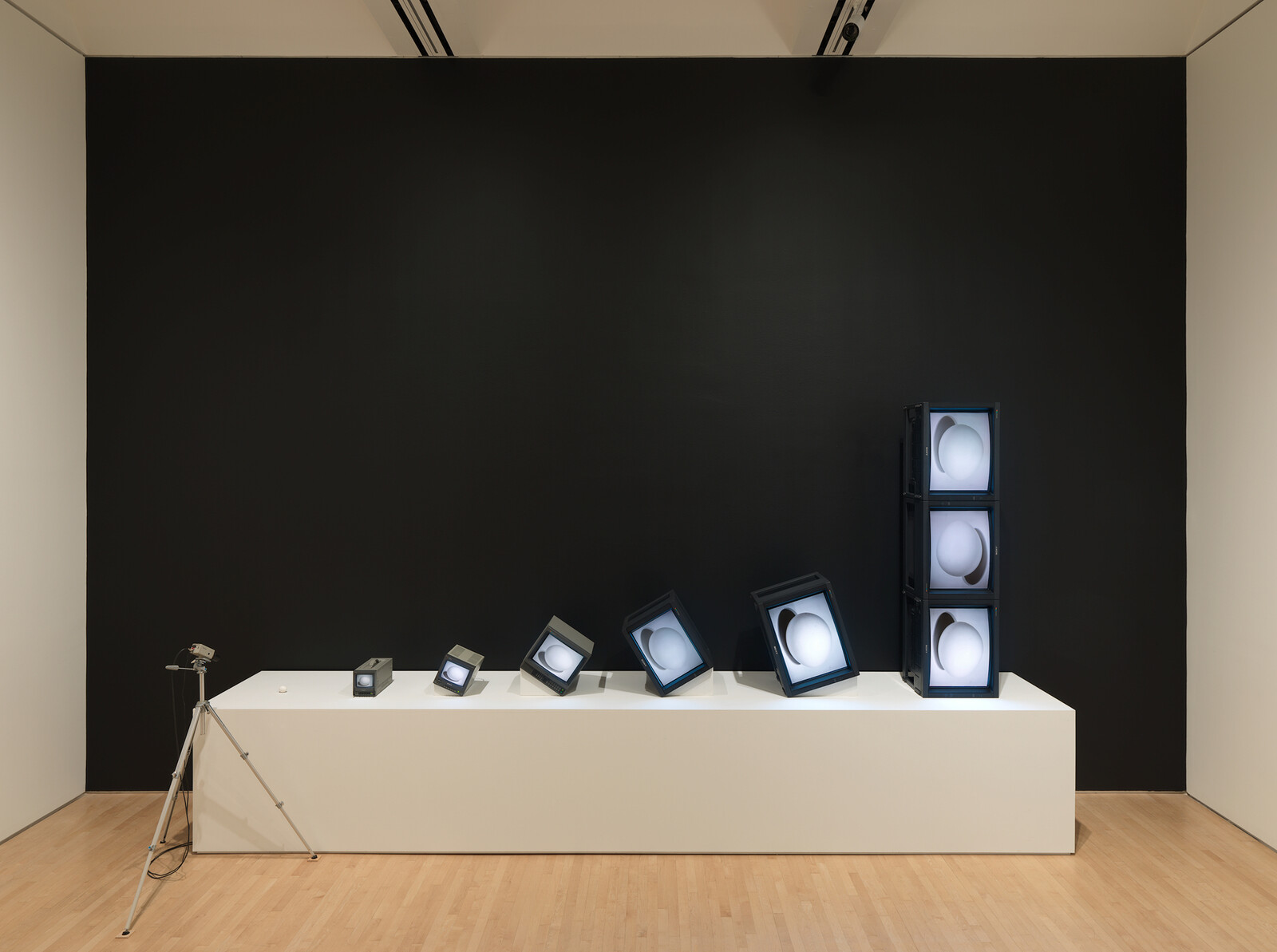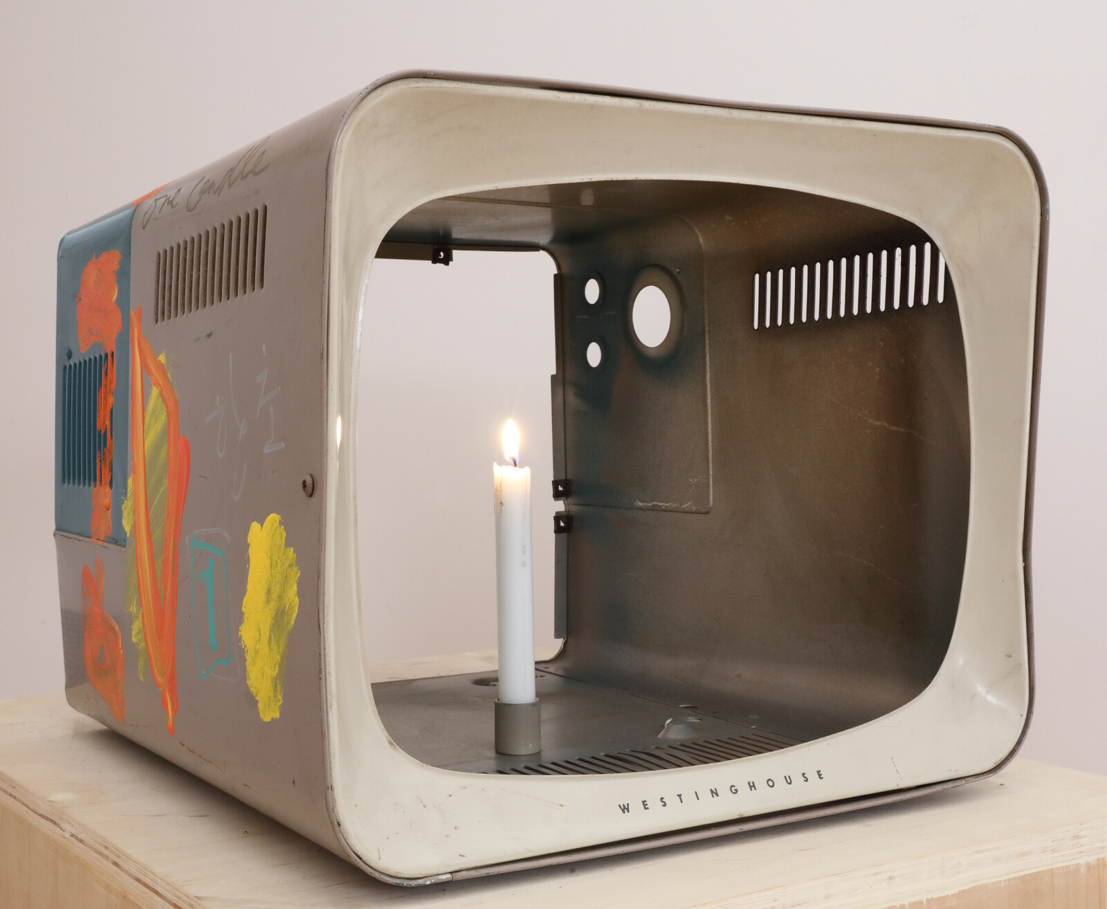 One Candle (also known as Candle TV, 2004), also on show in the Paik retrospective, plays with the transition between 3D materiality and the image by placing a live, burning candle inside a hollowed-out television set. The light of the flame is in contradistinction to the stream of electrons within the cathode ray tubes that normally powered TVs at that time. At first glance the TV looks defeated, a skinned, emptied vigil for bygone technologies. Closer inspection reveals a continuity between the candle and the cathode ray, the latter a descendant of the former. An irreverent monument to the history of technology, the discarded and broken appearance of One Candle conjures the past as a collection of wreckage piling up at the feet of Walter Benjamin’s angel of history. In Paik’s version, we are not propelled blindly away from the debris of the past by technological progress, but instead trace its lineage mournfully, knowing we can never move backwards through time.