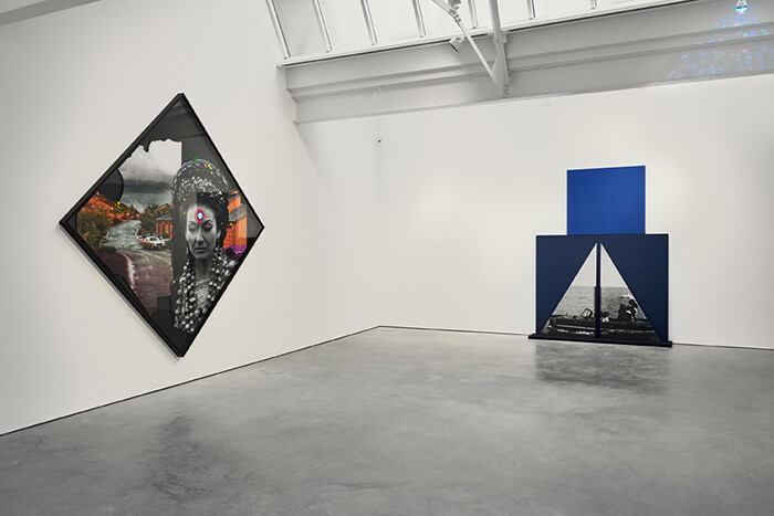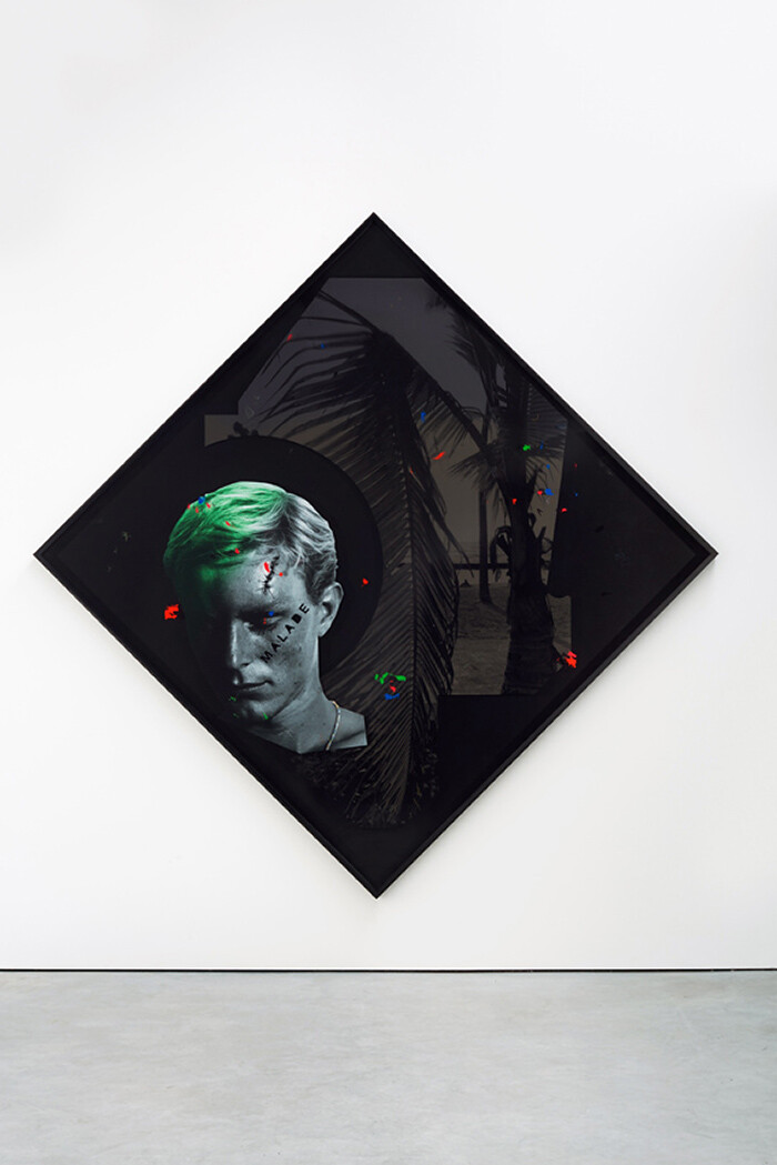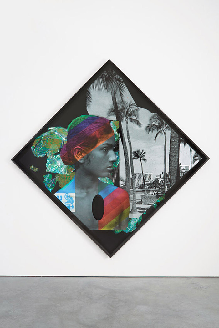 Arranged in their funky rhomboid frames, collages predominate, but there are two cut-outs stylishly adrift in the gallery’s main room. All the pieces encourage off-beam critique and outré guesswork while looking like a bunch of vaguely menacing hallucinations. The skies in Hempel’s collages come freaked with colored wire to short-circuit their holiday slideshow familiarity, or abstracted by inkjet pixelation into pure cosmic glitter. In the photomontage Storm (2015), the sun is a big black absence carved out of a borrowed photograph. Enjoying this bizarre meteorology is also a way of following the manic textural variegation of the show’s contents.