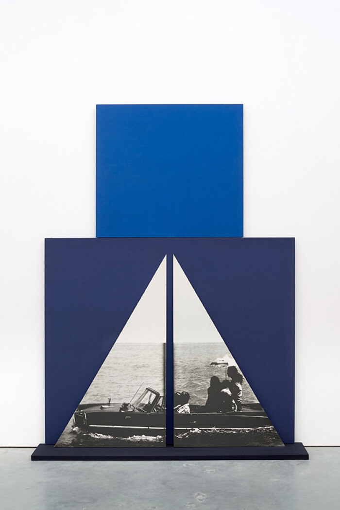 Jetsam (2010) unrolls a reproduced photograph of a traditional American daydream—the nuclear family in the convertible—onto a stainless steel representation of a sailboat. There’s Dad at the wheel, exultant in shades, as Ma and the kids shadow him anxiously in the back. A striking image anyway, but wait for the punch line: we’re in the middle of the ocean. The family drive is presumably being chronicled for a frisky early 1960s photo-essay on the short and doomed life of the amphibious car. Alongside the strange symbolic undertow of the whole scene, which could depict derangement or a family in dissolution with equal smoothness, there’s also the witty minimalist installation above the boat that approximates sea and sky via two fabric squares in differently shaded blues. The resultant assemblage is at once obvious, goofy, and calmly perverse. If Jetsam feels more like a wisecrack than everything else, it aligns with the other works that raid the past to conjure up futuristic meetings of surfaces and activities still too peculiar for our environment to accommodate. But it’s a wickedly illustrative joke, too, because logical certainties are so often hard to find in Hempel’s work: whatever you thought was dry land frequently turns out to be water.