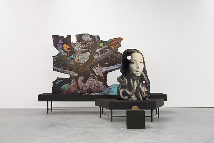 Nature Morte (2015) counts among its materials a grungy cut-out depicting a Japanese girl from a horror flick chewing pensively on a squid tentacle and a tangle of dry roots that suggests a clutch of withered snakes. The tentacle and the root neatly resemble each other, like two things drawn moments apart from the same maze of free association.