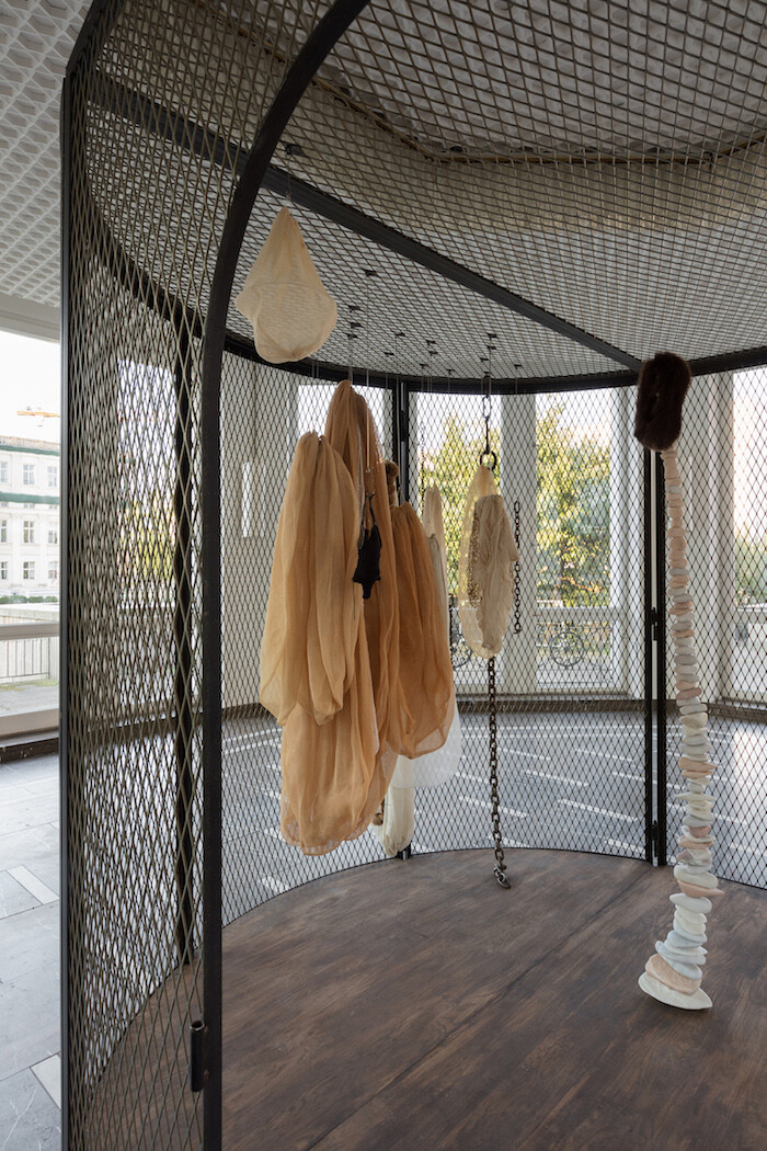 The pavilion’s main space, an octagonal room with floor-to-ceiling windows, hosts a single work: one of the “cells” that Bourgeois began making in the early 1990s. Peaux de Lapins, Chiffons Ferrailles a Vendre [Rabbit skins, Scrap Rags for Sale] (2006) is an oval metal cage in the room’s center containing other sculptures: two humanoid figures, hand-sewn in dark fabric, hang upside-down like voodoo dolls from an apparatus attached to the cell’s ceiling. Also suspended are textile sacks, mostly in shades of beige and cream (one is hot pink), arranged in flock-like groups. A thin stack of white marble stones ascends from the cell’s wood floor—atop this elegantly curved “spine” hangs an old-fashioned fur headband. Two thick metal chains connect the vertical space top to nearly bottom.
