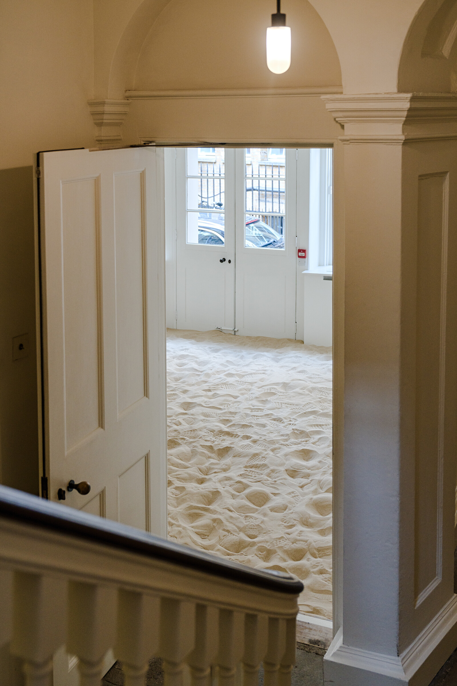 A child in red dungarees arrives at the door and points at me. “There’s a big man in the sandpit,” she announces to her father, getting his reassurance before dancing freely across the room. She writes her name in the sand, and in doing so shares something that the pseudonymous Lutz Bacher, who died in 2019, never did.