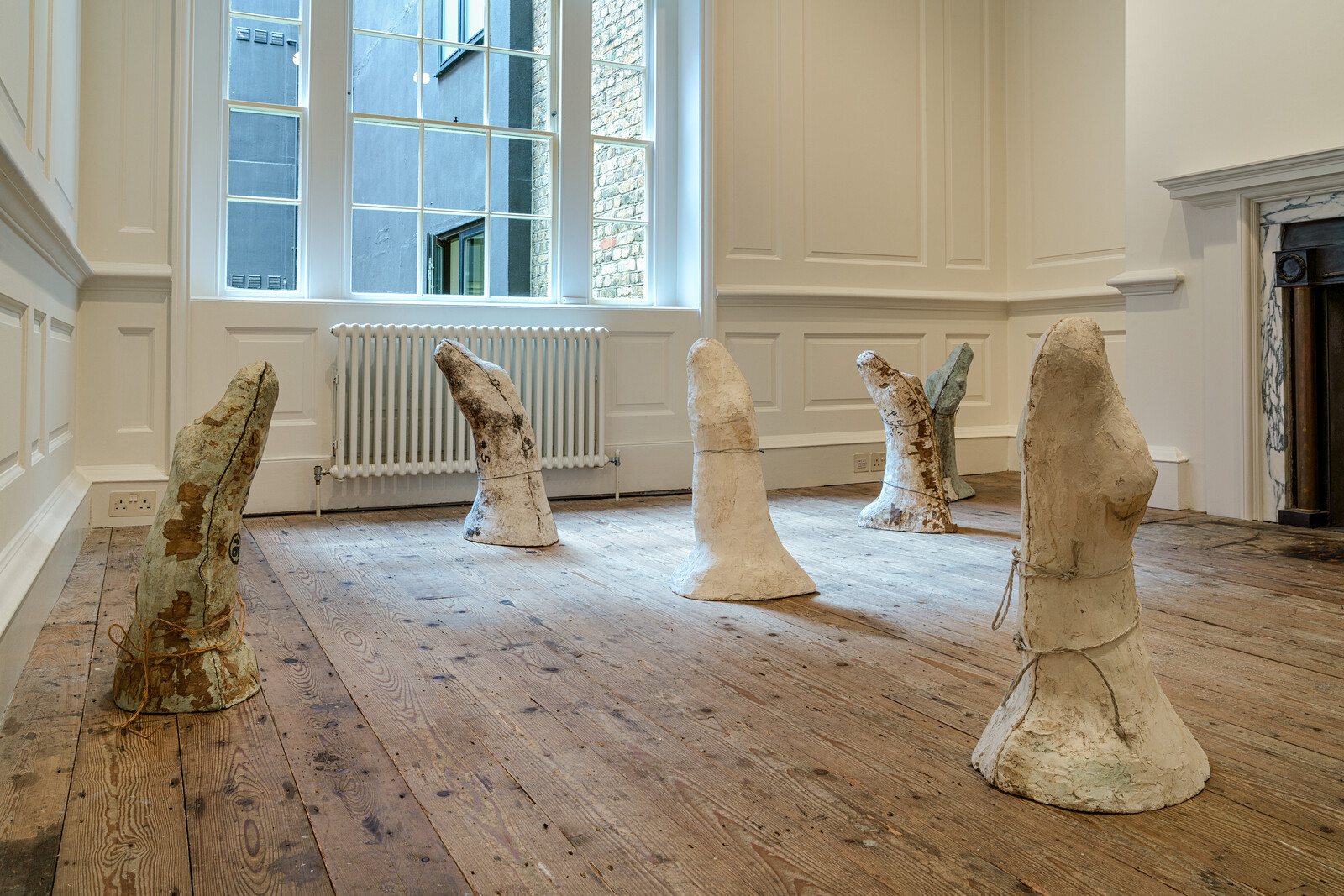 Her refusal of intellectual clarification makes the viewer attend instead to the subtleties of their visceral experience. No longer an aloof critic observing variations within a coherent oeuvre, I am a body in space encountering a series of challenges. Rather than identifying a cumulative argument across the show, I note the changes of affect from room to room. In PLEASE (LC) (2013–15), the speakers that amplify Cohen’s voice—loud and out-of-sync—push me around in search of respite. His unanswered pleas find material equivalence in the disembodied horse throats which, encrusted with wire, tape, and dirt, are also characterized by strangled helplessness. My own throat tightens, my ears ache, and I wish I could sink into the silent depths of Magic Mountain (2015) next door. The somatic intensity of Bacher’s art is foregrounded by the exhibition’s concern with sound—a medium that resonates through the body, seducing and repelling from one installation to the next. And the gallery’s domestic-scale rooms mean the viewer is forced to interact closely with the work, squeezed through tight spaces and into corners, so becomes hyperaware of their physical presence. I am “a big man in the sandpit.”