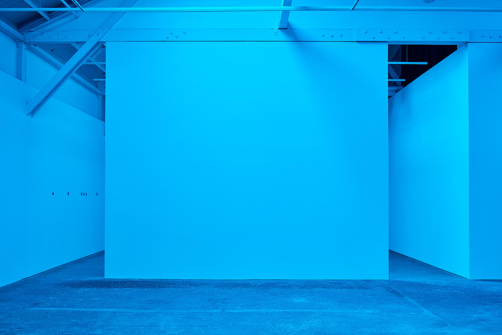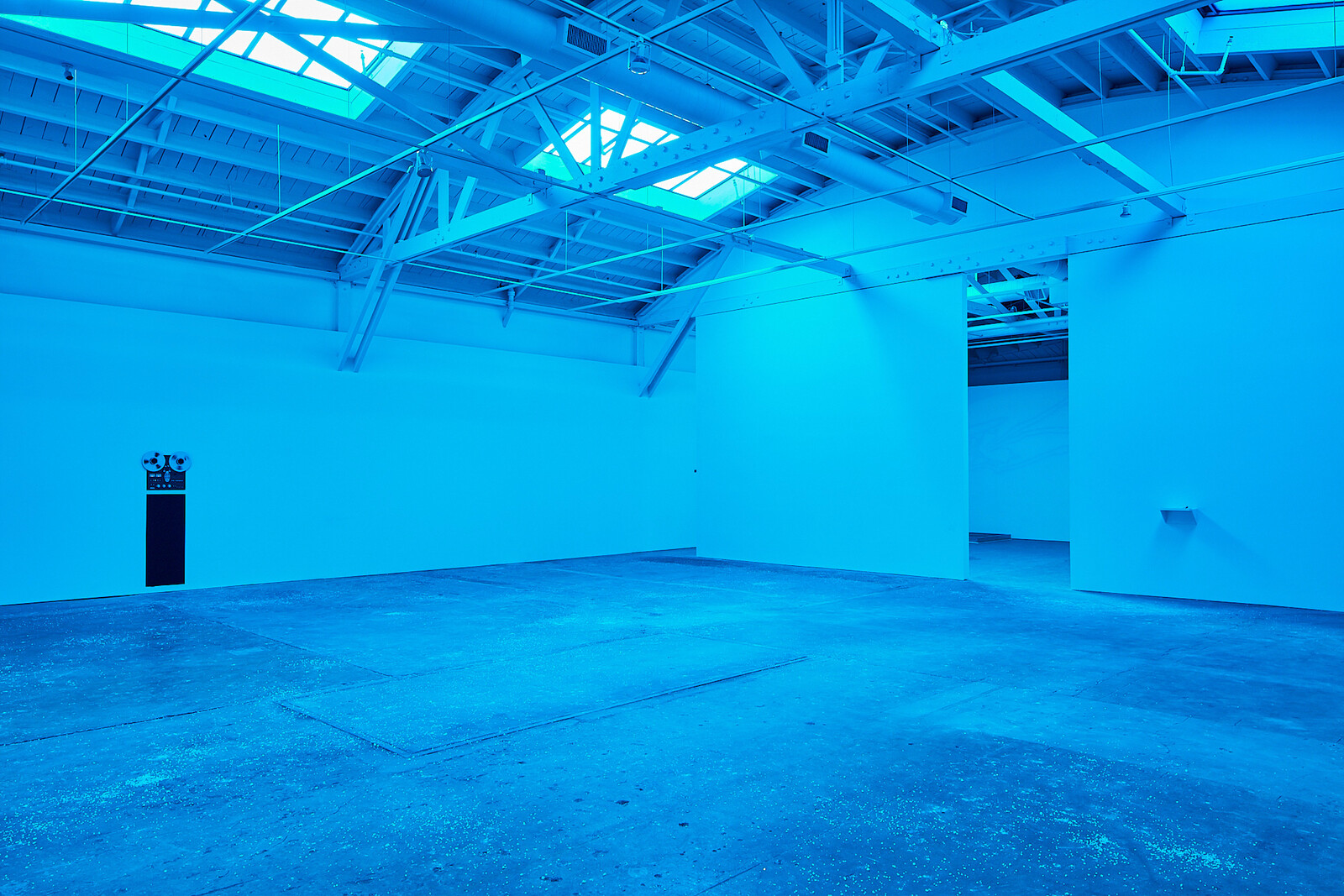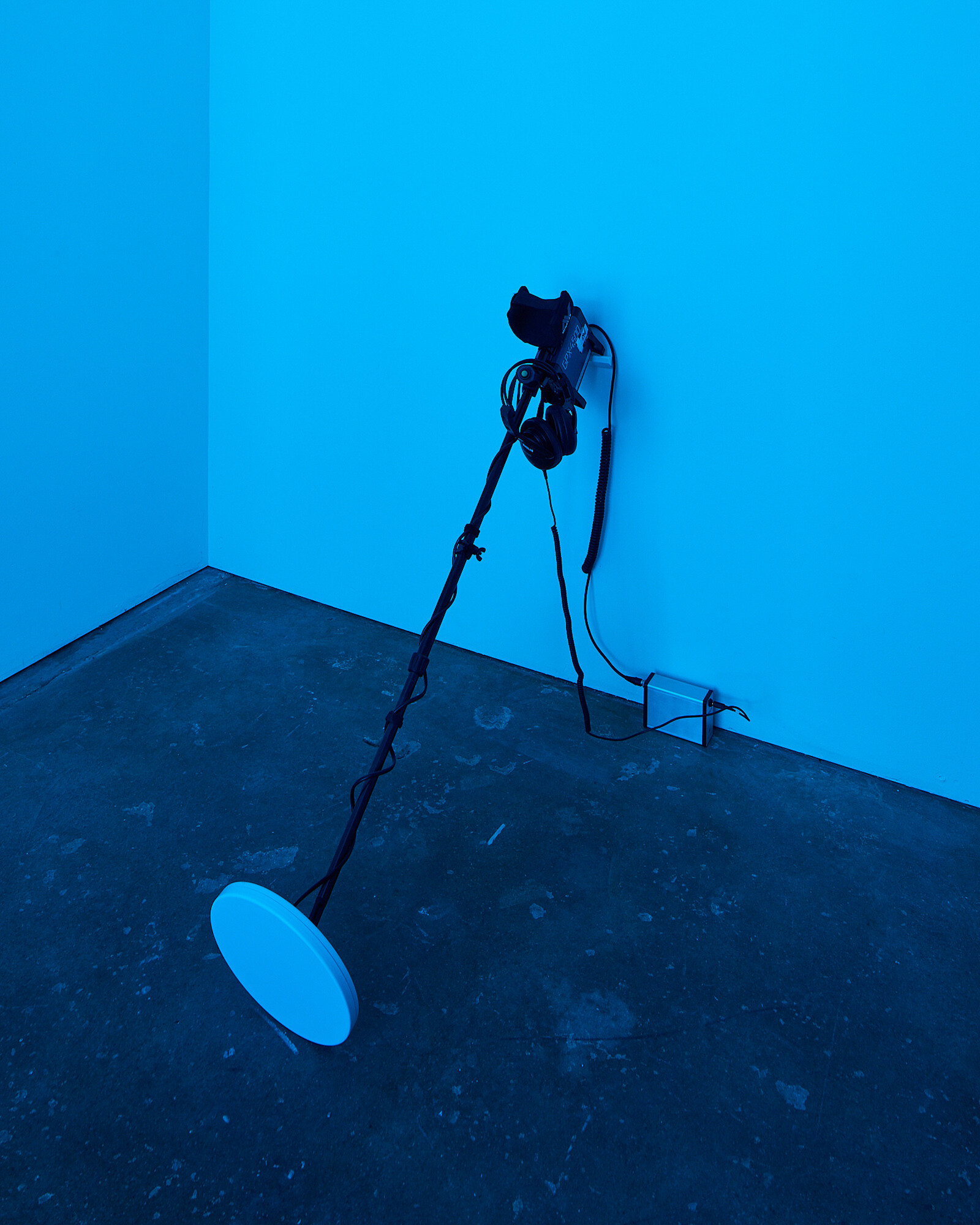 The second time I visited Lydia Ourahmane’s exhibition I was alone save for the young student-docent sitting at the front desk wearing earphones. Standing in the cavernous, quasi-industrial space—most of the internal walls had been removed—it felt appropriate that the last show I expected to see in a long time should be a near-empty room flooded with blue-tinged light (the front windows and skylights are laminated in sheer cobalt film) in which two tape decks mounted on opposite walls play recordings of an opera singer holding one note, and then another. The exhibition took on an elegiac air; the sung notes—a spare, tonal fabric—assumed the weight of lamentation.