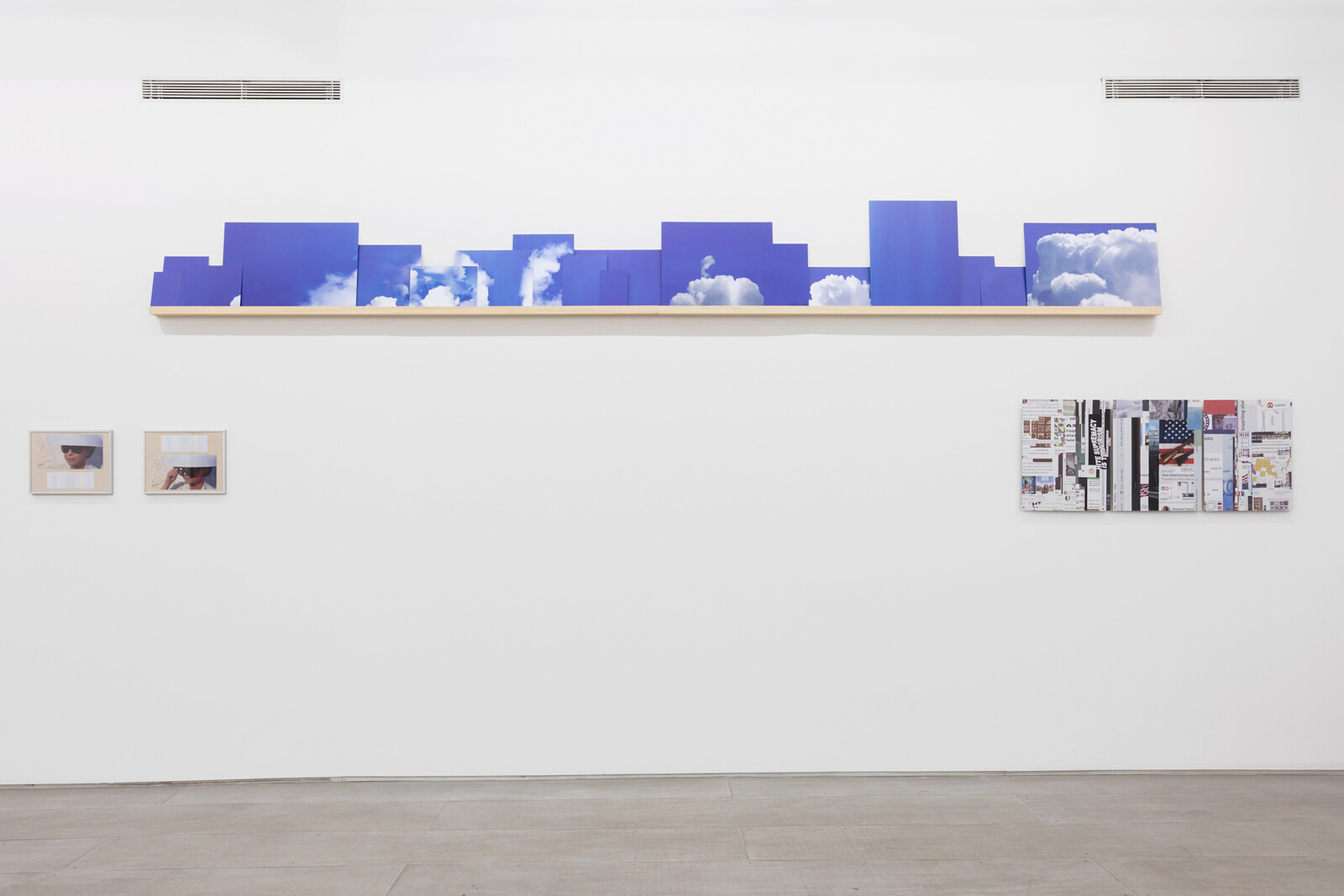 Installed at eye-level along the gallery’s main wall is Irving’s Sky_High (Low & fractured SMAERD) (all works 2021), a thin wooden shelf on which rest several square and rectangular panels that depict blue skies and fluffy clouds, cross-sections made from a digital composite image. The panels fill out the shelf’s sill, overlapping with one another from one edge to the other—such that its silhouette appears as a city’s skyline. Known for his exquisitely crushed assemblages that reproduce the contours of soda cans or takeout boxes onto the surface of fired porcelain, the slick, geometric dicing Irving applies in Sky_High doubles down on the Cubist impulse to use planar faceting to represent multiple perspectives of a chosen subject at the same time. By re-introducing a third dimension to the work via the shelf, on which the panels rest unfixed, Irving’s mosaic incorporates the saccadic function of the eye as it tries to scan or fixate on a discrete target.