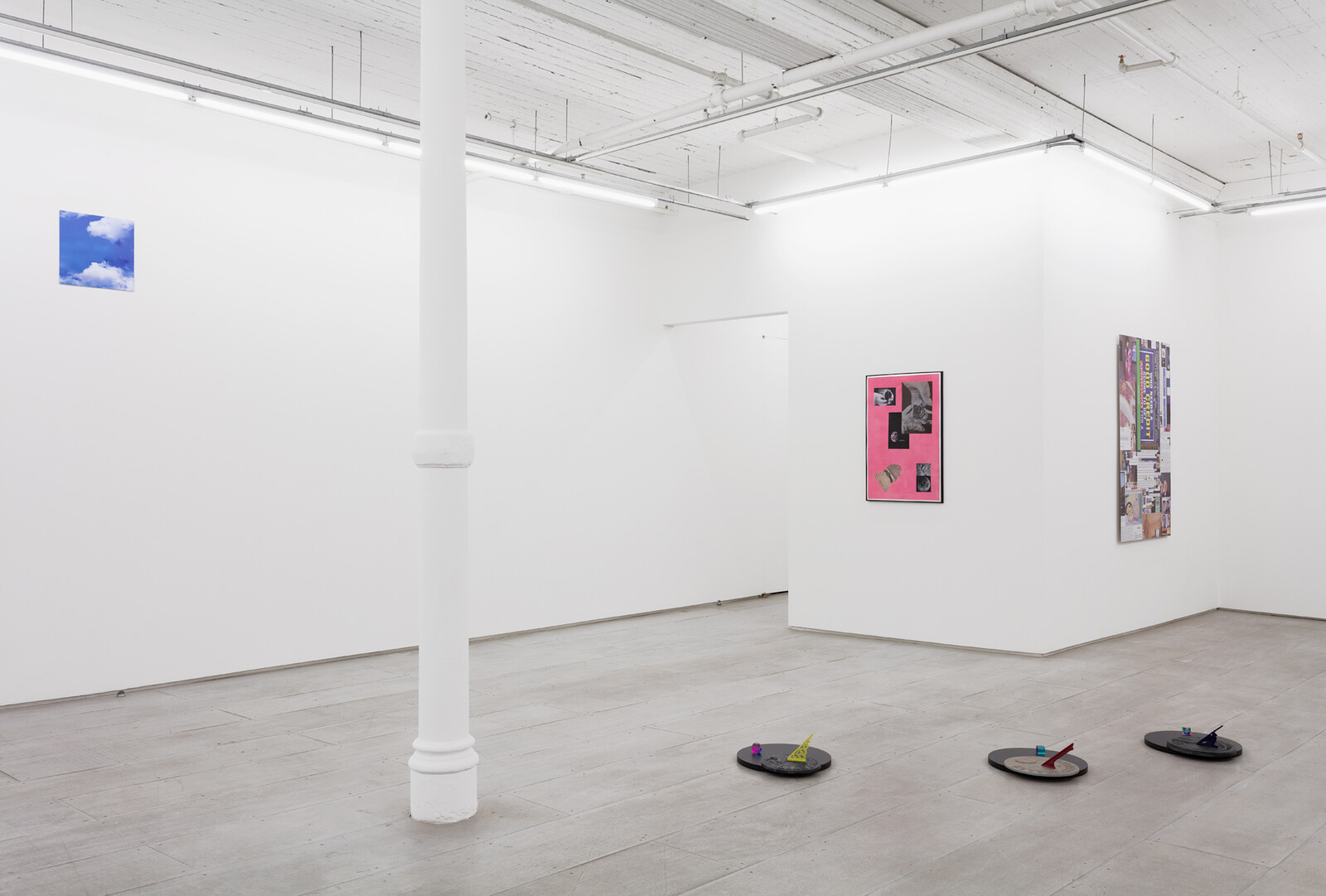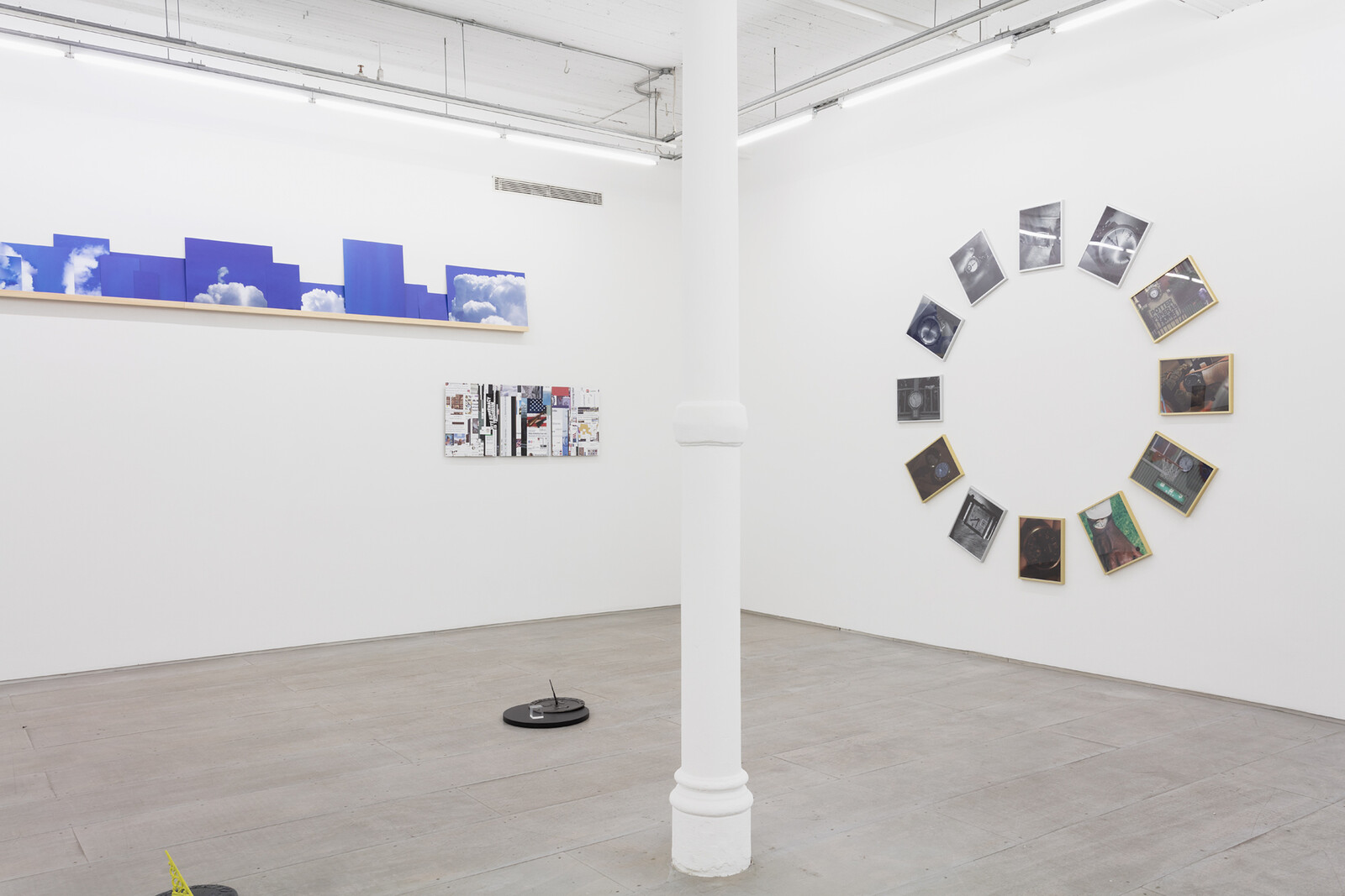 Installed on the floor of the gallery is Lyndon Barrois Jr.’s sculptural installation Immortal Objects I-IV—four cast iron sundials that seem to absorb the “weight of media” to which Irving alludes in the works mentioned above. Each timepiece is placed off-center on a flat, nondescript black plinth and juxtaposed with CMY polyhedrons. These bespoke geometric miniatures use a process called “subtractive color mixing” to emit the spectrum of cyan, magenta, and yellow filtered through white light. The color model is ubiquitous to printed materials such as magazines and books, and is one of the artist’s frequent referents.1