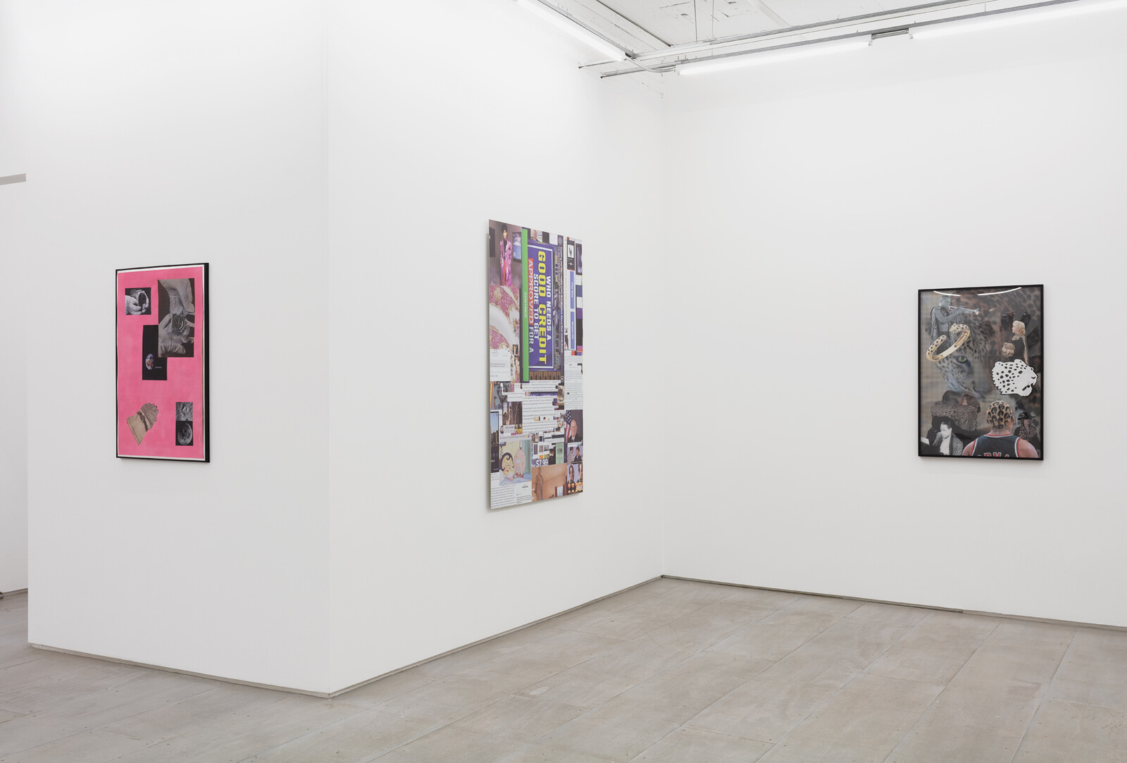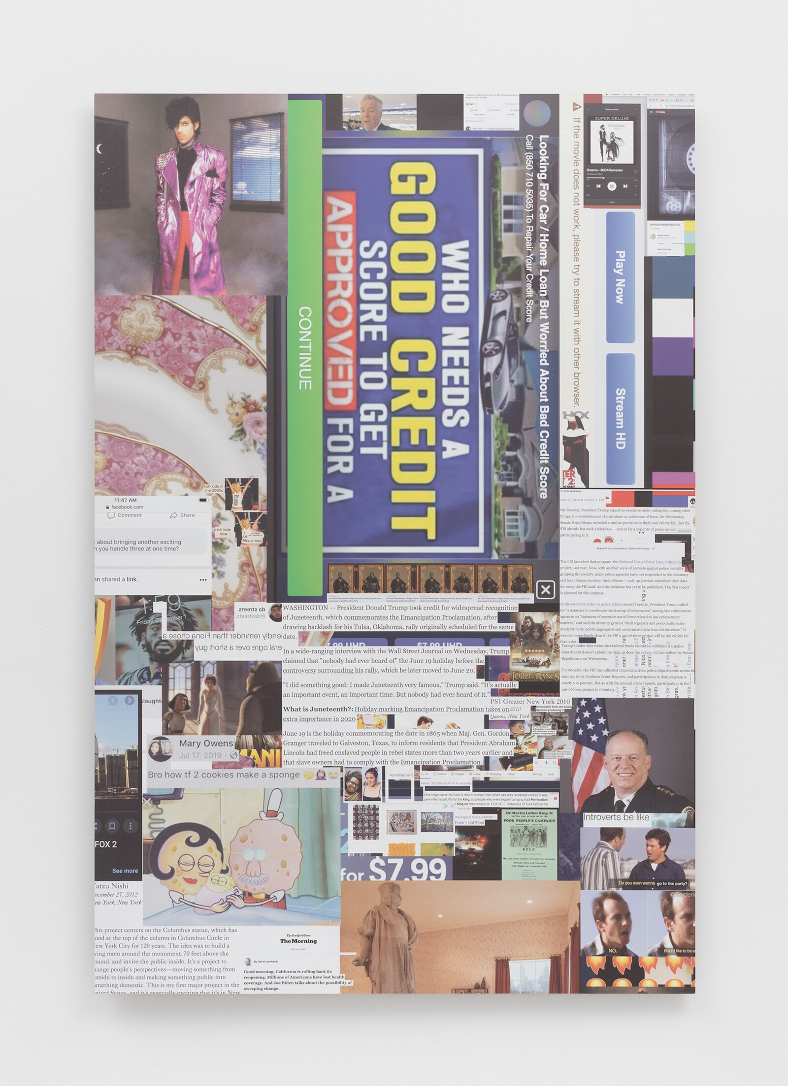 Two collages printed on vinyl by Irving, Means_Angles_Integers (The weight of media) #7 and Means_Angles_Integers (The weight of media) #8, are mounted on aluminum substrates and affixed to the wall. The layered screenshots from the collective DIY space we call the internet—glossy, beveled hyperlinks that appear on scam sites, cartoonish memes, and social media posts mourning the loss of Breonna Taylor—form a dense palimpsest of text and image. It is as if the artist were responding to Piet Mondrian’s highly proportionate, harmonious grids with a primal horror vaccui—a compulsion to exhaust delimited spaces. Irving floods these spaces with digitally mediated text, forcing your eye to build metonymic, rather than metaphoric, relations across them. Rather than allowing the grid to delimit sharp reds, yellows, and blues, these flat aggregates of shared images incompletely recollected collapse the boundaries we’ve learned to perceive contain them.