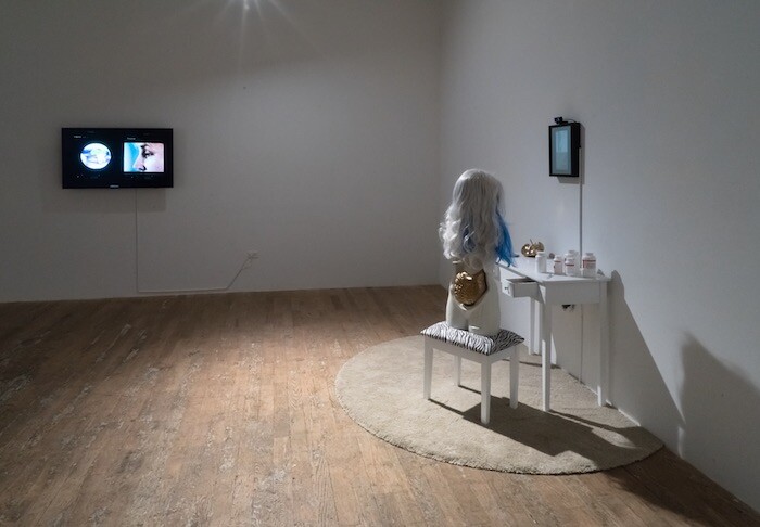What the internet promised—and perhaps initially achieved—was the means to range far from one’s own personal experience and location, although at this stage in its evolution, the web seems more likely to confirm prejudice and predisposition than eradicate it. It’s a bit like the theme of agoraphobia running through Hershman Leeson’s oeuvre. The woman in Lorna waits for her lover, talks on the telephone, smokes cigarettes, and combs her hair. The viewer gets to choose one of three end results for her life, but the protagonist eludes through her loneliness any ultimate control, of her own or by anyone else. But this comes with a price—an existence that never coheres. Elsewhere, as with the installation Venus of the Anthropocene (2017), which features a nude plastic torso with exposed guts and a couple of internal organs displayed on the vanity dresser in front of it (above which a surveillance camera hangs), it’s the female body that’s presented in fragments.