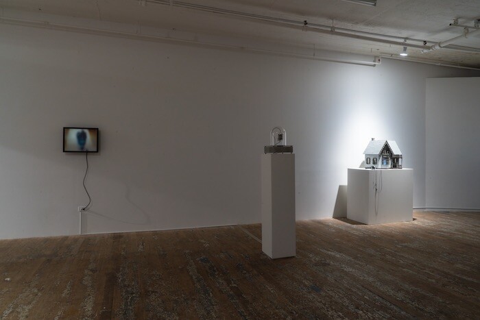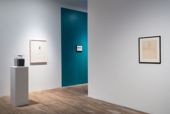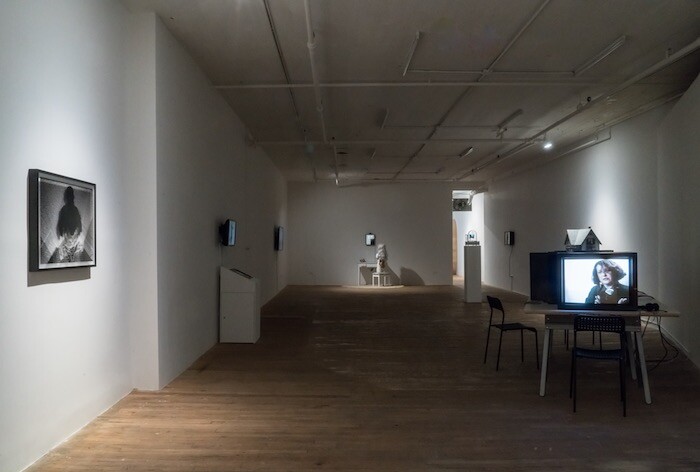 Along with showcasing an acclaimed artist whose reputation and significance have sharply increased in recent years, Remote Controls parallels on a reduced scale Hershman Leeson’s current retrospective at the Yerba Buena Center for the Arts in San Francisco, which originated at the ZKM in Karlsruhe last year. (Hershman Leeson is also an independent filmmaker whose !Women Art Revolution [2010] is among the most important documentaries of the feminist art movement in the United States.) At Bridget Donahue, Deep Contact includes the aforementioned audio accompanying video footage of a blonde woman in a low-cut blue dress who beckons viewers to “try to reach through the screen and touch me.” This obvious impossibility instigates other modes of interaction selected on the touchscreen directly beneath the monitor: for instance, following the woman along a path through the trees or encountering a demon that in turn gives the viewer a sense of what it’s like to be pursued.