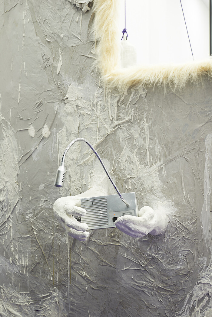 To the Pluto-in-Scorpio generation that planet’s transit has added significance: Scorpio is Pluto’s favored home among the stars. Zodiacally speaking, Scorpio is the existential celestial mansion, signifying sex, death, and all manner of dark matter. In popular astrology columns, the Pluto-in-Scorpio generation has been touted as a mystic rebranding of millennials, with social-media immersion recast as a drive to integration, to the synthesis of the plenum. What this means for art is a type of practice that could be dubbed “epic concretion”—“epic” in its reach across the largest scales of signification, and “concrete” in its drive to render such scale within the mundane detail of roughly cast plaster, stained carpet, inexplicable dripping liquid, and so on. Born in 1987, Bycroft is squarely within Scorpio-in-Pluto range. Her art is generously expressive of the epic concretion style, which, at 1646, is dispersed through a truly prodigious volume of objects, videos, and materials. Did I mention the spooky owl fresco nursing a miniature screen in its plaster wing? Or the roughly sewn textural drapes? Or the flesh-pink vinyl viewing mattress?