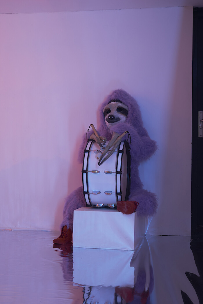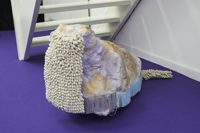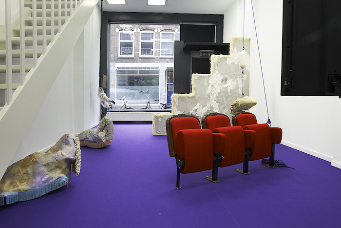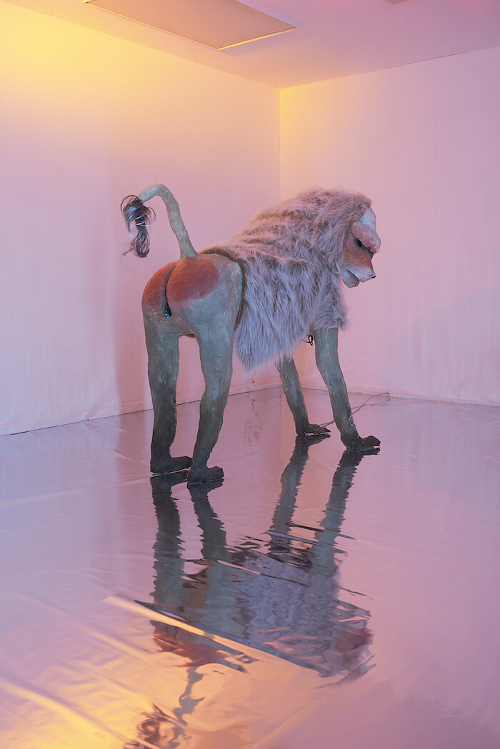 Pluto is the event-horizon of the zodiac. The third of the non-visible planets—a “dwarf planet,” according to NASA—Pluto makes its way around the ecliptic once in about 250 years, and leads transformation through bracing encounters with totality: with all that is present but unseen. Generationally, the 1980s and ’90s installation art of the Pluto-in-Virgo cohort (born between 1958 and 1971) constructed space with a nod to mediality, editing down ever more finely what differentiates “painting” from “sculpture,” for instance. Bycroft’s work, by comparison, is intent to manifest audiences in or as painting and sculpture. At 1646, viewers are ushered into an exhibition-world in which a life-size sloth slumps in a corner, the floor is covered in purple felt, plush, fringed couches have splintered off into factional units, and videos play on multiple screens.