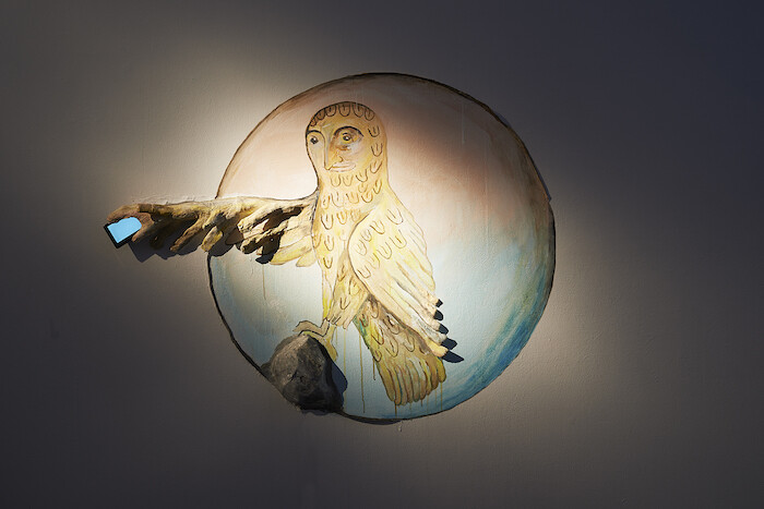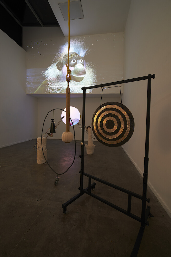 What is convivial in Bycroft’s show is wholly different from the “social practice” art of the Pluto-in-Libras (born between 1971 and 1984) that was prominent in the early 2000s and 2010s, when the relational reigned supreme and galleries were filled with experiments in assembling, deliberating, and agonistic virtue. Sociality, as it appears in Bycroft’s artistic cosmos, rears its head in mythic form. The social is a ghost, or a demon, or a hummed pop tune. It is the creepily sharp teeth of an alien-head-like sculpture that hangs knee-high off the floor, suspended from a rope. Whereas the authors of choice for the Pluto-in-Libra generation included Jacques Rancière and Chantal Mouffe, Bycroft’s exhibition cites a heady mix of psychoanalytic feminism, medieval bestiaries, and Heraclitus. Text in the Pluto-in-Scorpio approach is less “theory” and more “literature,” less prescription and more source material.