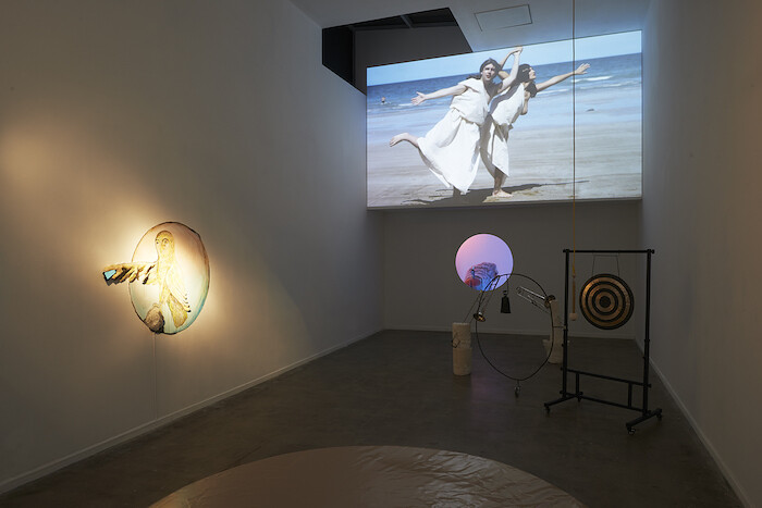 Following planetary motion through the zodiac, epic concretion arrives as art after Libran harmony. It is driven to the transgression of boundaries. And behold—in case viewers are distracted by the giant papier-mâché Minotaur’s head lurking in the ceiling-corner—Bycroft’s 60-minute video ˈʤɒli ˈrəʊʤər ænd frɛndz (Jolly Roger & Friends) (2018) will explain all, with a group of pirates (played by the artist’s friends and collaborators) that have sailed into international waters. Except, of course, the video is as unruly as the space one watches it in. Characters, costumes, and scripts tumble together in cacophonic surplus. The protagonists, a pair of eighteenth-century female pirates named Anne Bonny and Mary Reed, hold no narrative center. The trick seems to be a redistribution of attention—to watch it and to experience being in the exhibition-world at the same time.