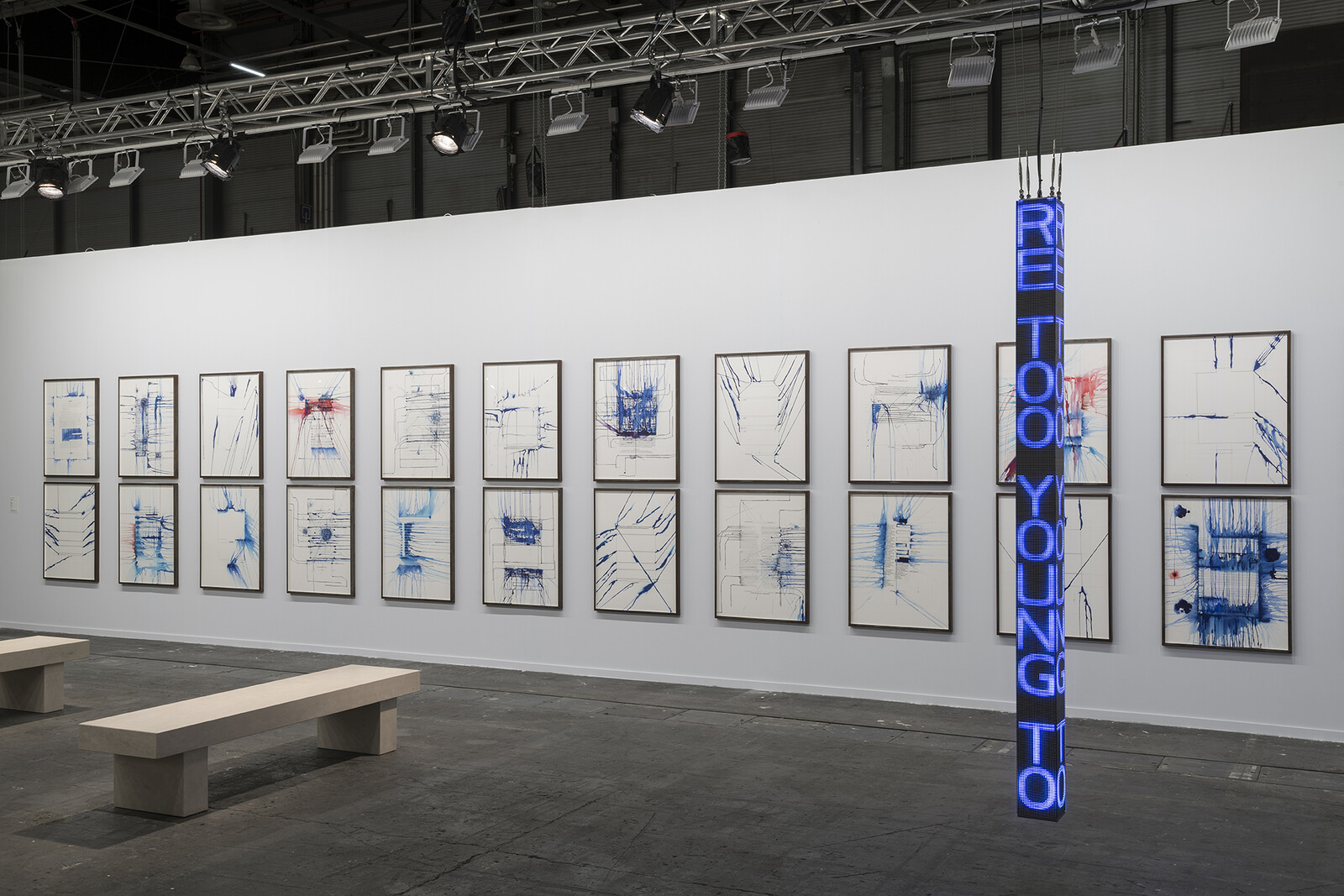 A few booths away, at Berlin’s ChertLüdde, I found the irregular, shapely sculptures of Rodrigo Hernandez and the irregular, shapely typographic poetry of Ruth Wolf-Rehfeldt. Fifty years between them, Rodrigo’s delicate, multidimensional pastel cardboard constructions find a quiet friendship with the monochromatic sheets of Ruth’s unspun language and punctuation. Tucked into an corner (maybe I just like corners to hide in at art fairs), a sensuous painting of a curvy polychrome body found itself slithering on wallpaper made by Rodrigo in homage to Ruth, an endless ocean of plus-signs and dashes, a Morse code of symbols referring to nothing but its own beauty.