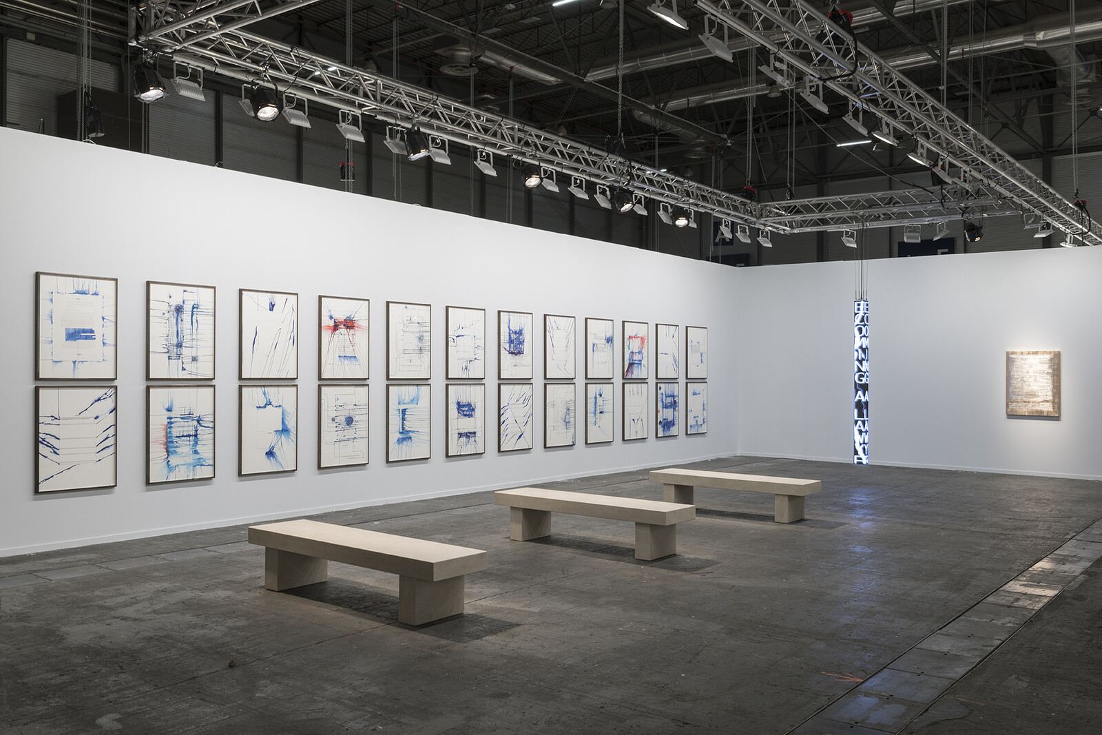Into the limestone bench of RAPTURE (2017), Jenny Holzer carved “Rapture Screamed Toward the Clouds.” The poetic clarity and political force of Hauser & Wirth’s booth, dedicated to a survey of over 30 years of the artist’s work, set a mood. In MOVE (2015), words drawn from interviews with victims from the war in Syria flickered on LED screens like a newsflash. About an earlier series of benches, Holzer said the words were drawn from “What actually happens to peoples’ lives as a result of unnecessary disasters.”1 The political weather outside is frightening, and artists weather-vane and resist in a million ways.