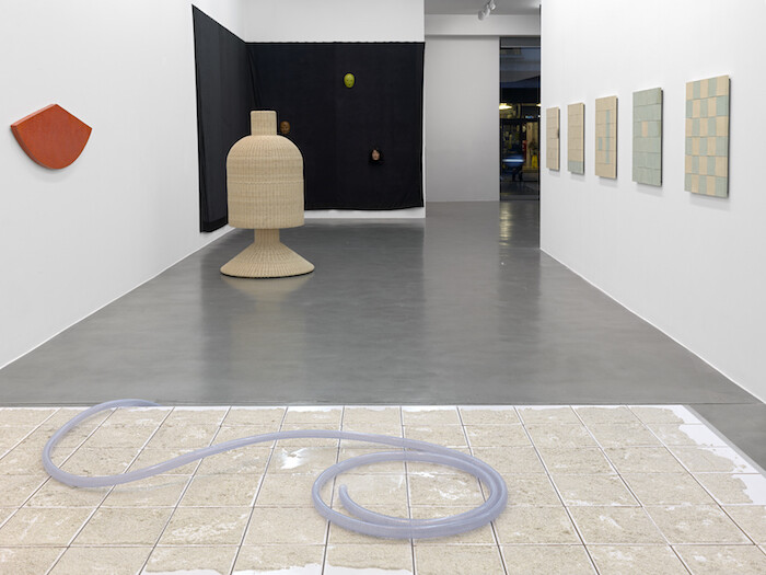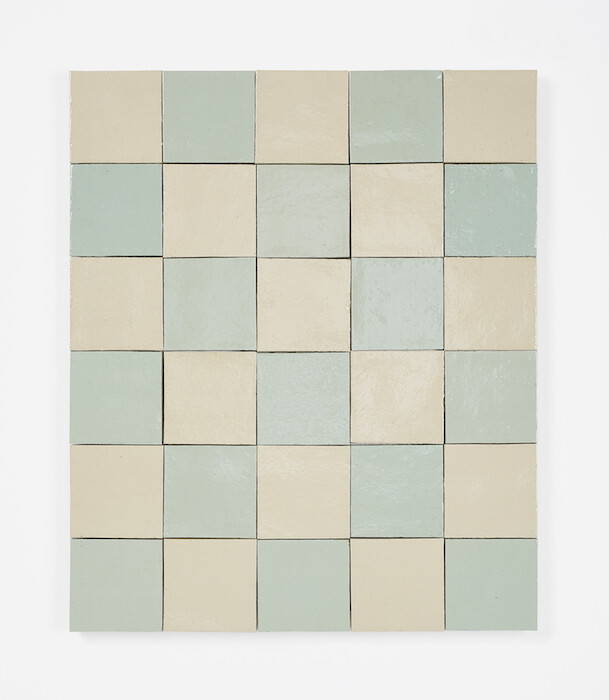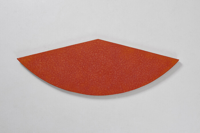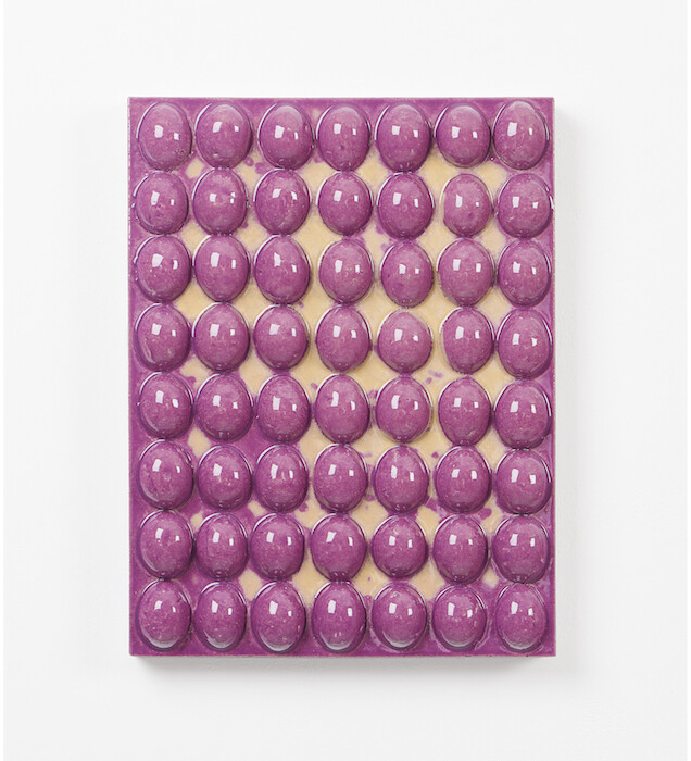This becomes all the more complex when such objects are considered to have been made from within Perret’s imagined society as they enact another, different, form of masquerade. Here, the handmade is not only made by hands other than those suggested, but the resultant object is, what? An art object masquerading as a craft object, or a craft object masquerading as an art object? Perhaps one needn’t settle upon an answer. The wall-mounted ceramic works here—tiles in two colors in various arrangements; rows of egg forms, as if placed within a box-tray; a tablet like a lustrous bruise clenched at its edges—all take as their titles capping phrases used within koan meditation. Once a monk has replied to a koan with satisfaction, the Zen master instructs the monk to find a fragment from a classical verse, or within a specially compiled phrase book, that expresses the newfound insight. Inevitably, these found texts are as open as those which prompted them, and here, used as titles, they suggest a way into the work which also leads elsewhere, to an experience which is precise, elusive, beautiful, open, endless.