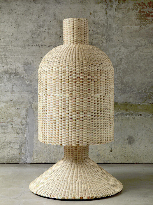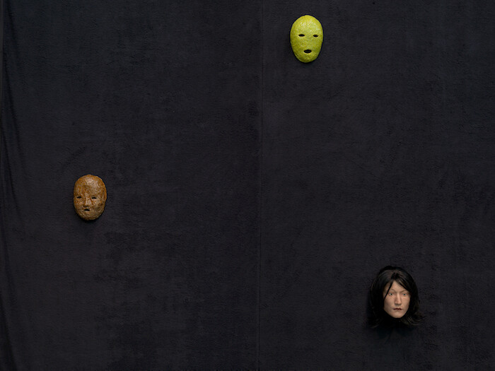 But the warrior is made of papier mâché, her gun is cast in resin, and, like much of Perret’s work, sits at a point between action and reflection, engagement and withdrawal. Many of the avant-garde movements of the earlier twentieth century might now be considered to occupy a similar place, where political materialism advanced alongside aesthetic abstractionism, and in so doing they have become an important source for much of Perret’s work. In this exhibition it is Sophie Tauber-Arp’s “Dada Heads,” turned wooden forms resembling hat stands, and often similarly featureless. In Perret’s Natural Sophie, the scale has been increased markedly, the height of this “head” now the height of our entire body, and its material altered, now woven in wicker and so referring back to the applied arts within which Tauber-Arp was first trained, and also the craft objects which the members of Perret’s fictional commune might occasionally sell at local markets. If its scale gives it immediate presence, the blankness of its form gives it distance, too, something which Perret has previously spoken of as being important to make abstract her own subjectivity. No doubt this also relates to the various “faces” or masks within Figures II, two of which are ceramic and simply formed, almost as though pareidolic finds, and one of which is made of silicone and far more realistic, even if it then comes to settle within the uncanny valley.
