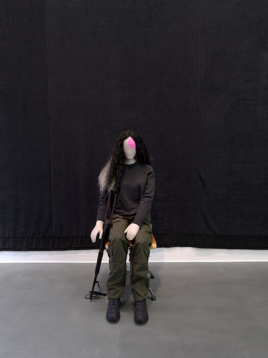 Sometimes an artwork responds to the world outside; sometimes the world outside responds to an artwork; and sometimes neither knows of the other, yet each is enhanced by it all the same. Such a moment occurred recently when one could march down Piccadilly, in protest with and in the presence of tens of thousands of women, and turn into a side street, past cars, jammed, Porsches, Bentleys, and Rolls, in each a man tapping agitated fingers upon a leather steering wheel, enter the glass door of a gallery and there find a mannequin, female, with long crimped hair and army fatigues, an assault rifle at rest by her side.