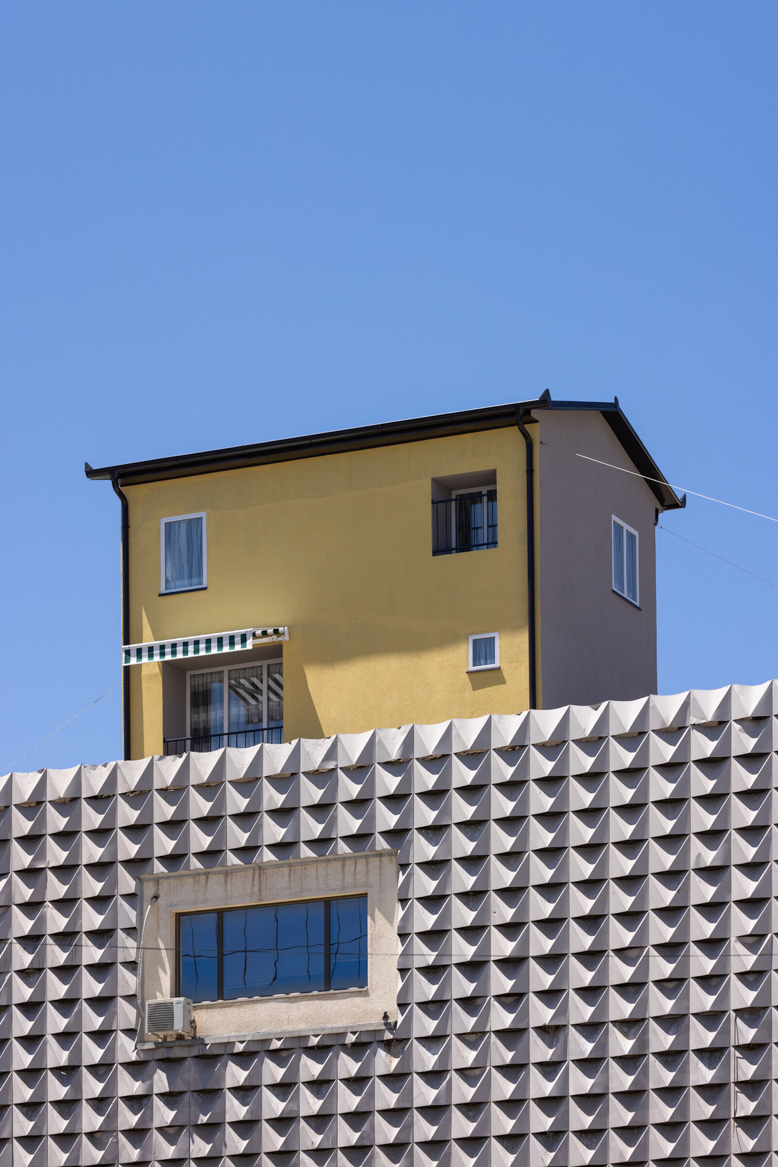 Stories never really end, and the narratives most always transform over time. On Sunday the city was quiet, nearly bereft of international art world visitors. At the Centre for Narrative Practice, a newly established community and educational hub in the former Hivzi Sylejmani Library, an artist collective from the nearby town Fushë Kosova discussed the problem of having to name themselves and issues of funding. I slipped into the back door of the former Gërmia Department Store to solve the mystery of Above Everyone (2022), a house built on the rooftop by artist Alban Muja, a humorous response to the lack of affordable property after the downfall of Socialism. The windows are lit at night, and rumor had it that someone is living there. I was discovered by an employee of the Ministry of Infrastructure, the current occupant of the building, who kindly escorted me upstairs, where I found an empty shell with quaint curtains in the windows.