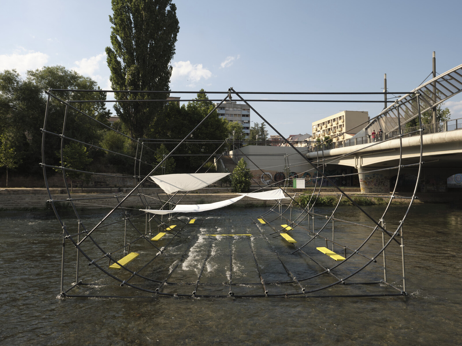 Yet the most effective and emblematic artistic intervention may be Europe Without Monuments (2022) in Mitrovica, a contested city not far from Pristina, where the Ibër river divides the Serbian and Albanian communities to the north and south respectively. In the water next to the central bridge, patrolled by NATO peacekeeping forces, Ukrainian artist Stanislava Pinchuk has installed a skeletal deconstructed version of Bogdan Bogdanović’s 1973 Monument to Fallen Miners, a massive temple-like portal built atop a hill in memory of those who fell in a revolt against German occupation of the Trepča mines during WWII. Farther down the river, artist Piers Greville recruited kids from both sides to create a human bridge by swimming against the currents, in the performance What Is Here (2022,) a feat documented in a video at the Grand Hotel. The whole project is the brainchild of curator Petrit Abazi, an Australian who was born in the city, and local officials said that such a collaboration would not have been possible without the mediation of an international organization. In the evening, as the sun goes down and temperatures cool, the structure comes alive as children and dogs alike slosh into the water to play around it. I walked uphill just before sunset led by a brave little stray dog, who sauntered through the monument’s columns and continued down the other side into the trees while I took in the expansive view—and there was no sign of a division from up there. The conclusion to this story: Manifesta is what an international biennial should be, a show reflecting its context and transforming it in turn.