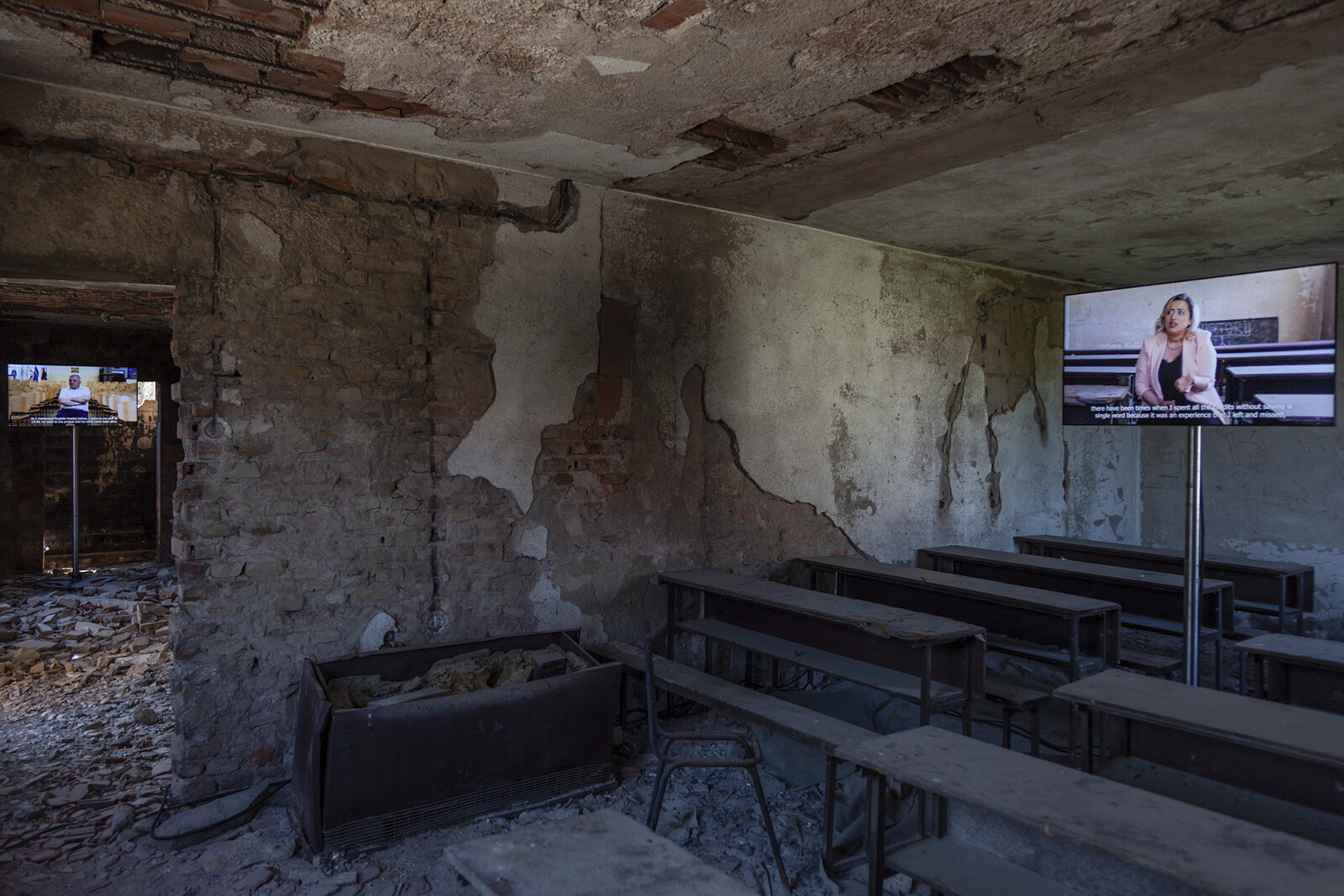 The biennial fills in the blanks for visitors to Pristina by opening and contextualizing significant spaces forgotten in the flurry of daily life. On a hill at the periphery of town, in the burnt shell of the Hertica School House, the NGO ETEA presents videos of moving interviews with former students and teachers on screens set up among the desks, surrounded by shards of broken glass and rubble. The unfinished home was offered by Mehmet Aliu-Hertica to students and staff of the Sami Frashëri High School so they could finish their education in secret after 1990, when the Serbian regime excluded ethnic Albanians from official institutions. One former student recalled being told to take different routes to school and not to walk in groups to avoid being discovered by Serbian soldiers. A classmate went missing for two days after being told that he would be forced to eat his notebook if he was caught again.