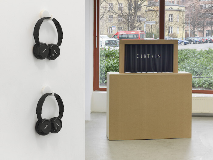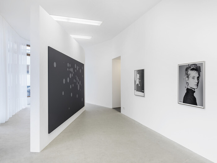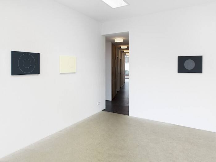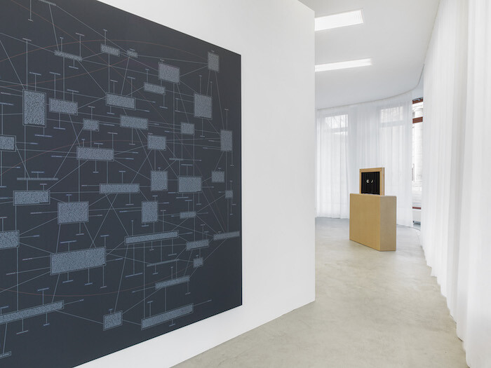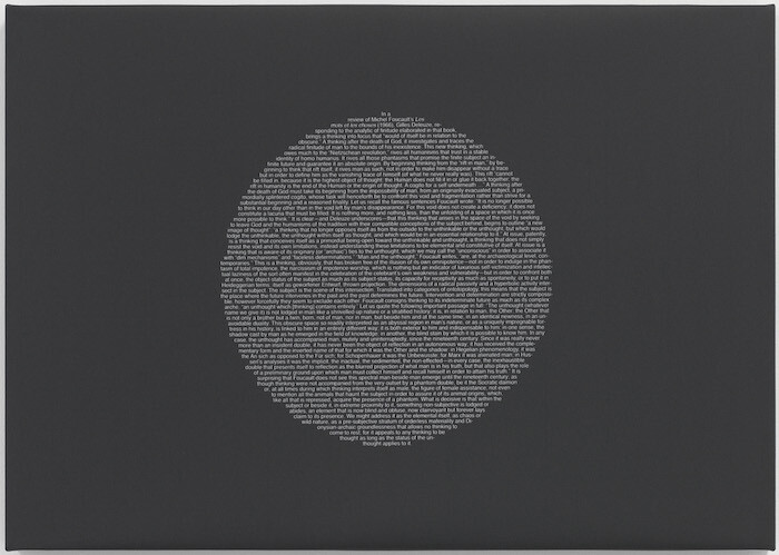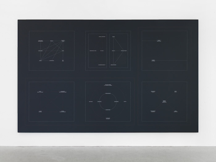 Steinweg presents 13 paintings from the series from which the exhibition takes its name. Cleaner and tighter than some of his earlier works on canvas, they feature sleek white digital letters printed on dark backgrounds, or a hide-and-seek of grey and yellow hues. Each presents a section of text, sometimes simply words, other times diagrams, or what might be regarded as a new sub-species of aesthetic literature, concrete philosophy: text arranged into layouts that resemble waves or—at the risk of bringing the obscurities of quantum physics into an already intellectually weighty exhibition—particles. There are hybrids as well, meditations on Hegel that form the familiar interlocking circles of the Venn diagram. In a sense, works like number 12 (the series is not titled but numbered)—come closest to manifesting a genuinely insightful philosophical proposition: the symbolic status of words is sufficiently flexible to encompass a lexical meaning as well as a visual and procedural meaning simultaneously. More overtly schematic works present the names and ideas of thinkers in flowcharts, Euler circles, and enigmatic graphs charting the relative being-to-nothingness ratio of different philosophers (fun “fact”: Badiou is both more being-y and nothing-y than Sartre!). Some might dare utter the word “pretension,” but it is rather enjoyable to follow all the connections—real and tenuous—that these expansive mind maps trace. Also, the very oddness of a being-to-nothingness graph, expressing the deepest philosophical questions with the tools of quarterly earnings reports, is, in itself, an articulation of a wry deflationary truth.