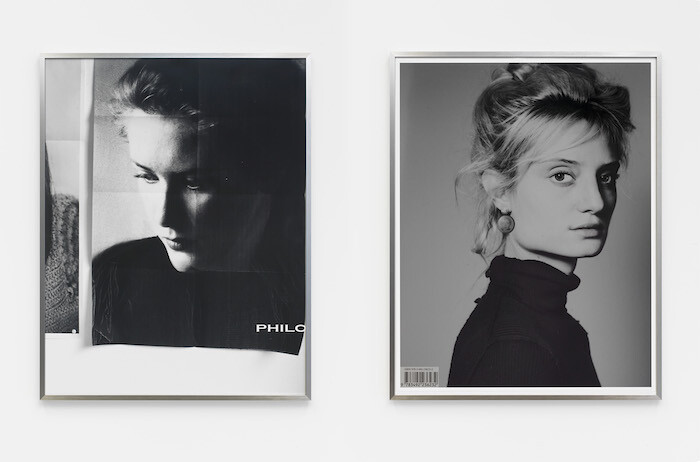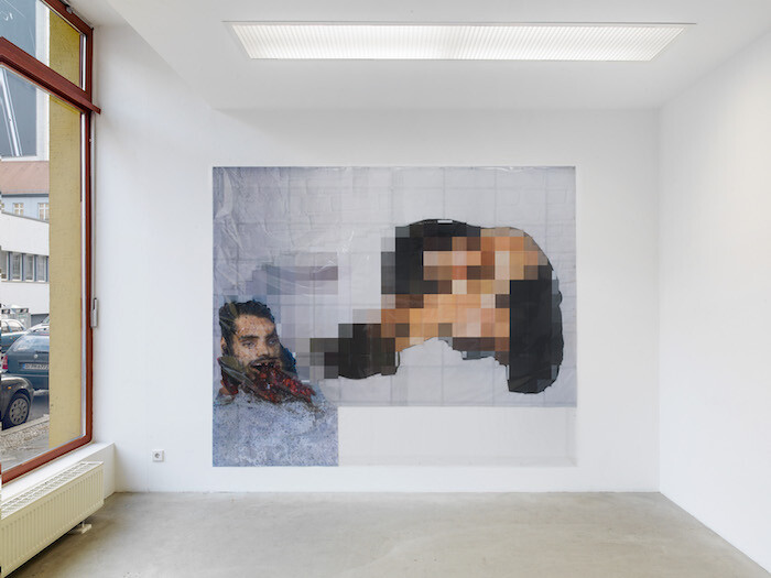 Though Steinweg makes up the majority of the show, there are other works on view by his frequent collaborators and aesthetic interlocutors, including Rosemarie Trockel, Thomas Hirschhorn, Marcellvs L., and Bethan Huws. Trockel and Hirschhorn come off particularly well in the configuration of “For the Love of Philosophy,” with the magazine visages of Trockel’s Freudian Slip (2017) and Homesick (2017) gazing impassively at the deep-thought bubbles of number 1 in Steinweg’s series. In Hirschhorn’s NSFW Pixel-Collage No. 77 (2016), positioned just across from the aforementioned being-to-nothingness graph and other high-minded works, a severed head in the lower left-hand corner serves as a reminder that reason is nodding off to sleep as this new(ish) century matures, and that, for all the profound meditations on the nature of being, we also contain a terrifying counter-rational impulse that is increasingly proximal to the surface.