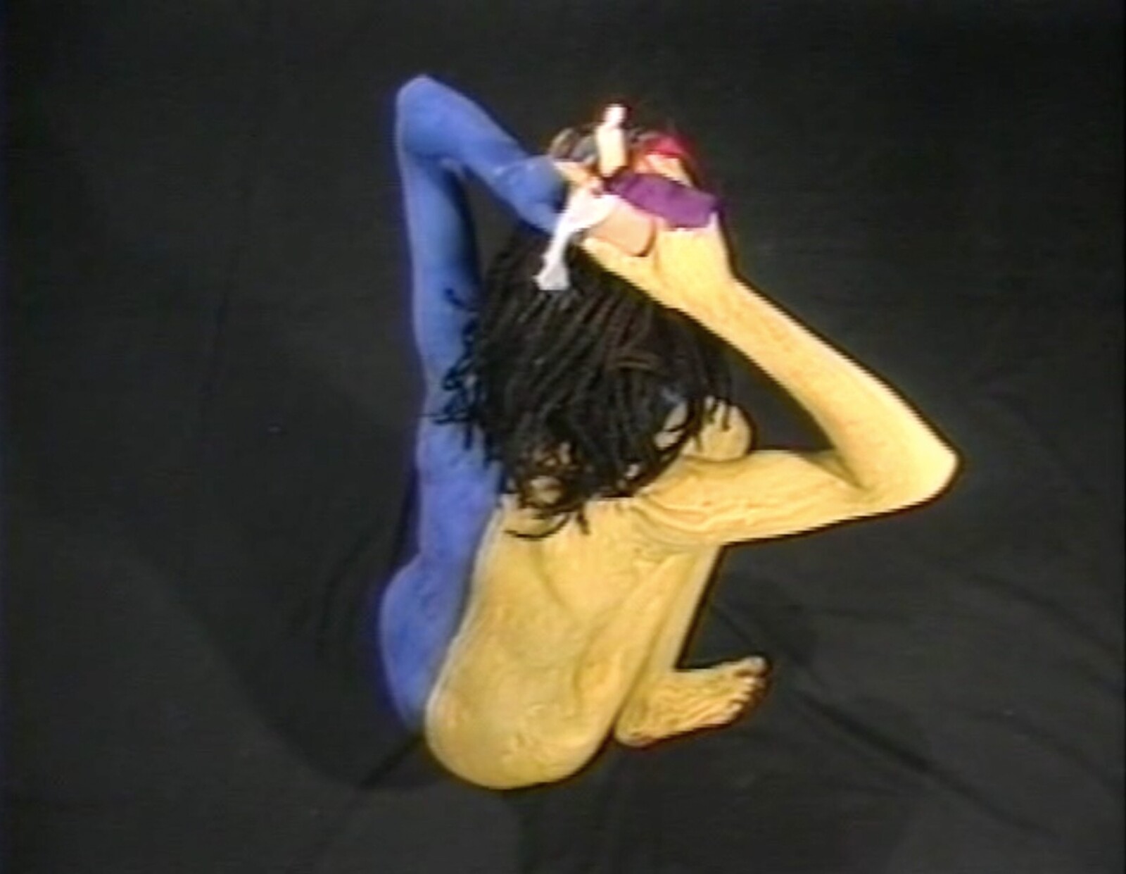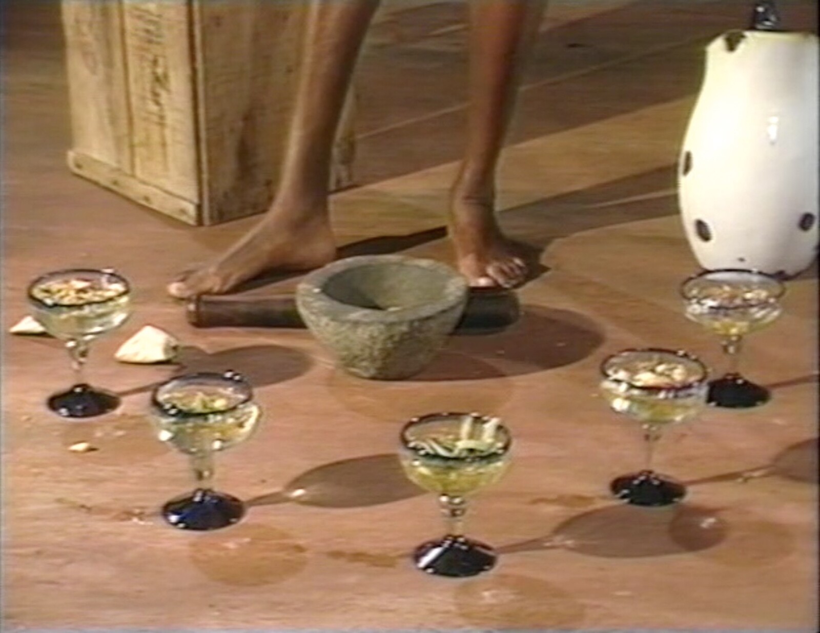 The show’s backbone is a large-screen display of Rite of Initiation - Sacred Bath (1991), one of the artist’s signal video works, propped diagonally on the floor like a slab in the center of the space. In its opening scenes, we see a figure’s bare feet and legs step around a red line drawn around a tree trunk, then, shod, take to a manmade road—a passage from nature to city. After a jump cut, the initiation rite begins with the figure—Campos-Pons—setting up five stemmed glasses around her again-bare feet. She fills them with flower petals, herbs, and then water, and over the next half-hour the ceremony continues: incantations; deliberate movements; close-ups of body parts often decorated with leaves, earth, or symbols like chalky white crosses or footprints. Liquids including water, milk, and blood flow on or over the body. There’s percussive, jazzy music, and incantatory narration in Spanish and English (“We came to water to find rest,” “Those who love can recognize each other at first glance”). The video culminates when a kneeling Campos-Pons—half of her silhouetted, nude body tinted white in post-production, the other half blue—silently pours water from two pitchers into a river or ocean.