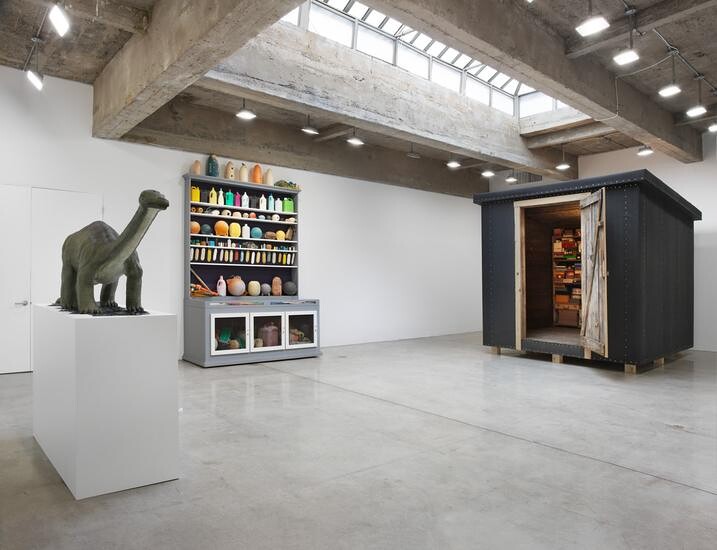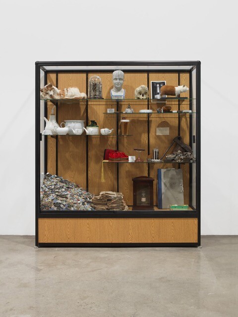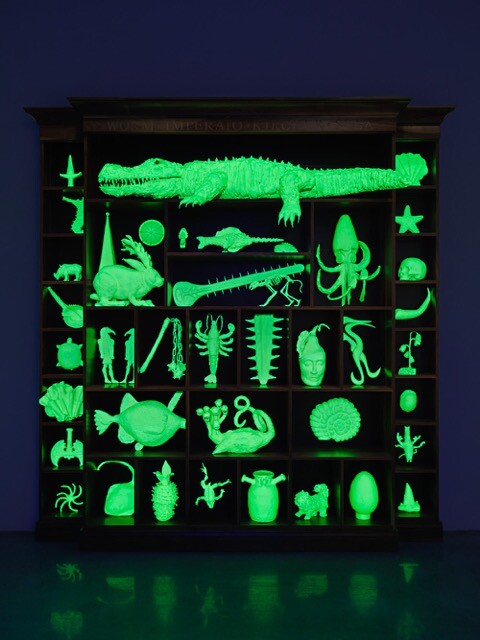 Continuing the exhibition’s interest in nature as pop and play, The Phantom Museum (Wonder Workshop) (2015), a collection of neo-1970s glow-in-the-dark chartreuse 3D sculptures based on seventeenth-century engravings (and made with students from Colgate University), are displayed in their own room as though in a horror-house natural history museum. Among them is the famous nineteenth-century multi-headed Hydra of Hamburg about whom it fell upon Carl Linnaeus, on his visit to the city, to remark, “You are aware it is a fake?,” crushing the imaginations of child and adult alike. While Phantom Museum is good-natured and whimsical, An Archeology of Disorder (2016)—a trophy or specimen case complete with shelves of crowded dusty objects and emblems of mental affliction—explores the exhibition’s interest in the darker, indeed sinister side, of natural history’s constructions of the normal and the pathological. Forming a kind of essay of objects, An Archeology of Disorder is as serious and studied as an essay by Foucault.