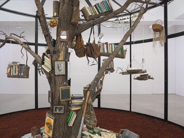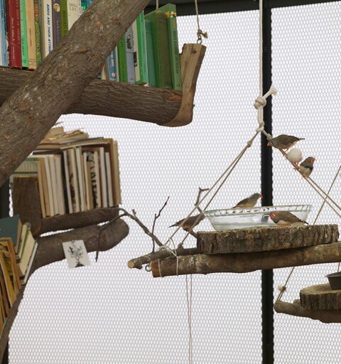 While a quick impression of the works on view suggests Dion has broken no new ground, and may even be recycling what have become all-too familiar tropes, it is the contingent, the detail, the specificity of the subject matter of each piece, that reveals once again Dion’s cogent, nuanced, and up-to-the-minute dissection of this self-interest we call nature. For instance, the formal elements (monumental bird cage, dead tree trunk, shelves and piles of books, photographs of iconic figures, paraphernalia from the study of nature-culture, and 18 live zebra finches and 4 yellow canaries) of the large immersive atrium The Library for the Birds of New York (2016) look much like what one sees in photographs of Dion’s 1993 installation The Library for the Birds of Antwerp. But context and historical juncture is key to both. The Library for the Birds of Antwerp referenced art history, birds and painting, and colonial aspects of owning birds, parrots in particular, as symbols of stability after the Thirty Years’ War, while The Library for the Birds of New York juxtaposes images and books of progressive nature conservationists with the study and culture of science (there is a well nibbled chemistry textbook in the bird poop-covered pile at the base of the tree). These themes are contrasted with references to the persecution of birds by hunting and study of them (the zebra finch is the laboratory corollary of the white lab mouse; the canary is the obvious metaphor in the coal mine), but also through our devotion to the domestic house cat—a copy of Catwatching and Catlore, Desmond Morris’s 1986 book on cats, peeks out from the pile of books. Nonetheless, the wonder, pathos, and humor of hanging out in a transient home for these robust and clearly delighted avian constructs of human research and signifiers of mortal toxicity is a blast.