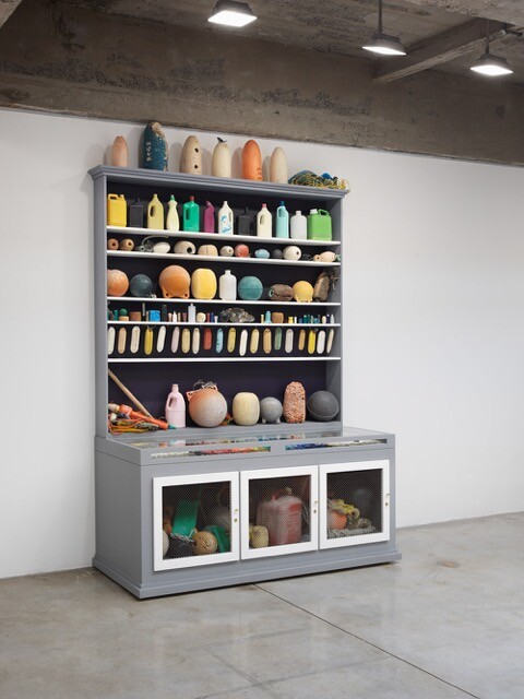 Of all the works in the show, Cabinet of Marine Debris (2014) is the piece most in need of background, as the magnitude of what is on display is easy to miss. Marine-themed objects, displayed in familiar natural history museum cabinet format, attest to Dion’s self-described role as disaster-chronicler because they are selected from tons—yes, tons—of garbage Dion collected while part of an expedition of researchers, material scientists, and artists (sponsored by the Smithsonian, National Geographic, and the Alaska Wildlife Federation, a foundation founded with the settlement money from the far from transient 1989 Exxon Valdez oil spill). As with The Library for the Birds of Antwerp, it is not the formal construction of the piece (unless one is seeing Dion’s work for the first time) so much as the significant horror of the subject matter that sticks in one’s gut, like the ubiquitous plastic bags we now find twisted inside birds. For these bottle caps, arranged by color, from as far away as Japan, China, and India, plastic buoys from Japanese squid fishing nets, barnacle-covered light bulb, rubber gloves, and tools are merely a tiny selection of the knee-deep garbage thrown daily onto these remote Alaskan shores by the gargantuan Pacific Gyre (also known as the Great Pacific Garbage Patch).
