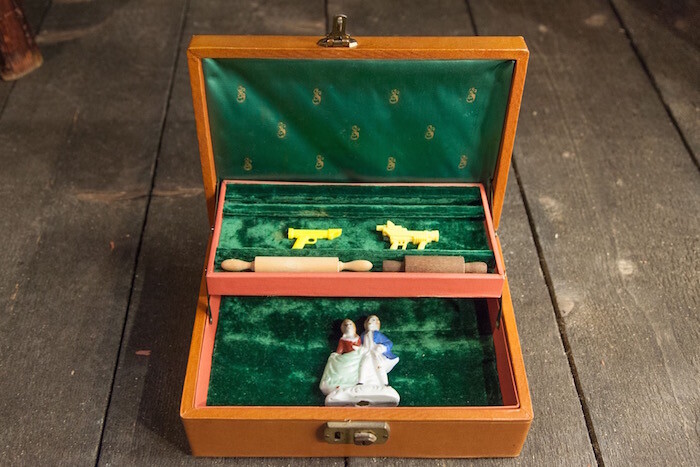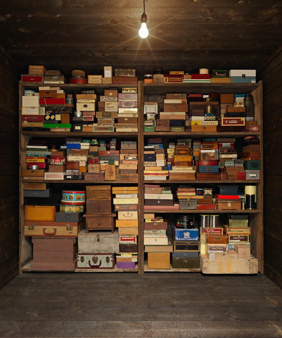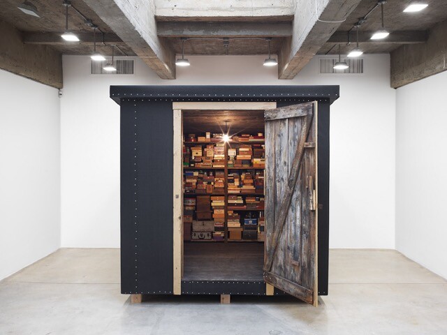 Memory Box (2016) takes the theme of the castaway, the lost object, and the remainder back into a more colloquial, even personal, evocation of the obsessiveness of collecting. In fact, this ramshackle shack, reminiscent of the structures found at Dion’s and J. Morgan Puett’s living artist’s colony Mildred’s Lane, in rural Pennsylvania, rivals The Library for the Birds of New York for the interactive, immersive pleasure with which it engages the viewer. After one enters by stepping up and into its dark interior, one is confronted with hundreds of variously sized and functioning beat-up metal, silver-plated, cardboard, wood, even velvet boxes and drawers. These ungainly piles, as if discovered in a dead uncle’s attic, line the wall from floor to ceiling with mystery and obsession. Each contains some oddity Dion has collected over decades of expeditions to flea markets, thrift shops, and rural yard sales. What makes it so enjoyable is also what makes it so quietly subversive: visitors are given full freedom to open and fondle, break and steal (although that was not the artist’s intent) anything—from a set of wish bones placed in an old silverware box (“one of my favorites,” he says), to a miniature metal reindeer sculpture, or tiny nineteenth-century ivory double-edged comb for combing lice from one’s hair, old board games, and even actual fauna (a centipede). When asked whether it bothered him that things might be stolen, or even broken and mutilated, Dion responded with pointed emphasis, “The wear and tear is definitely part of it. I mean, isn’t that the whole point? These ideas we have about art are not natural so we need to push back.”