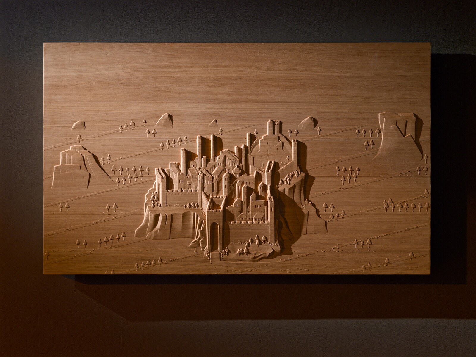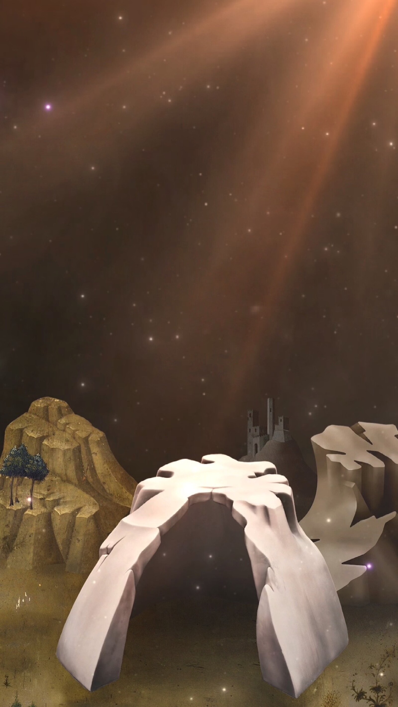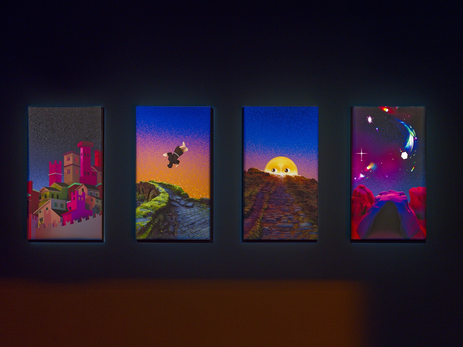 The sound and activity of the exhibition rotates around the perimeter of the room as the various videos are activated in turn, creating the sense of a whirling carousel. Through a squint (a small opening, traditionally in a church wall) we explore a CGI city under a sky woven with stars, based on the painting Una città sul mare by Sassetta (1423–26), a landscape which begins to revolve around on an axis as organ music crescendos (Mercy I Cry City, 2024). Elsewhere a pair of novelty toy unicorns become awestruck by a rundown seaside fairground exalted with multicolored lights that dazzle their glittery eyes (“everywhere eyeballs are aflame”), causing their entire world to spin like a Waltzer (DAZZLEDARK, 2023).