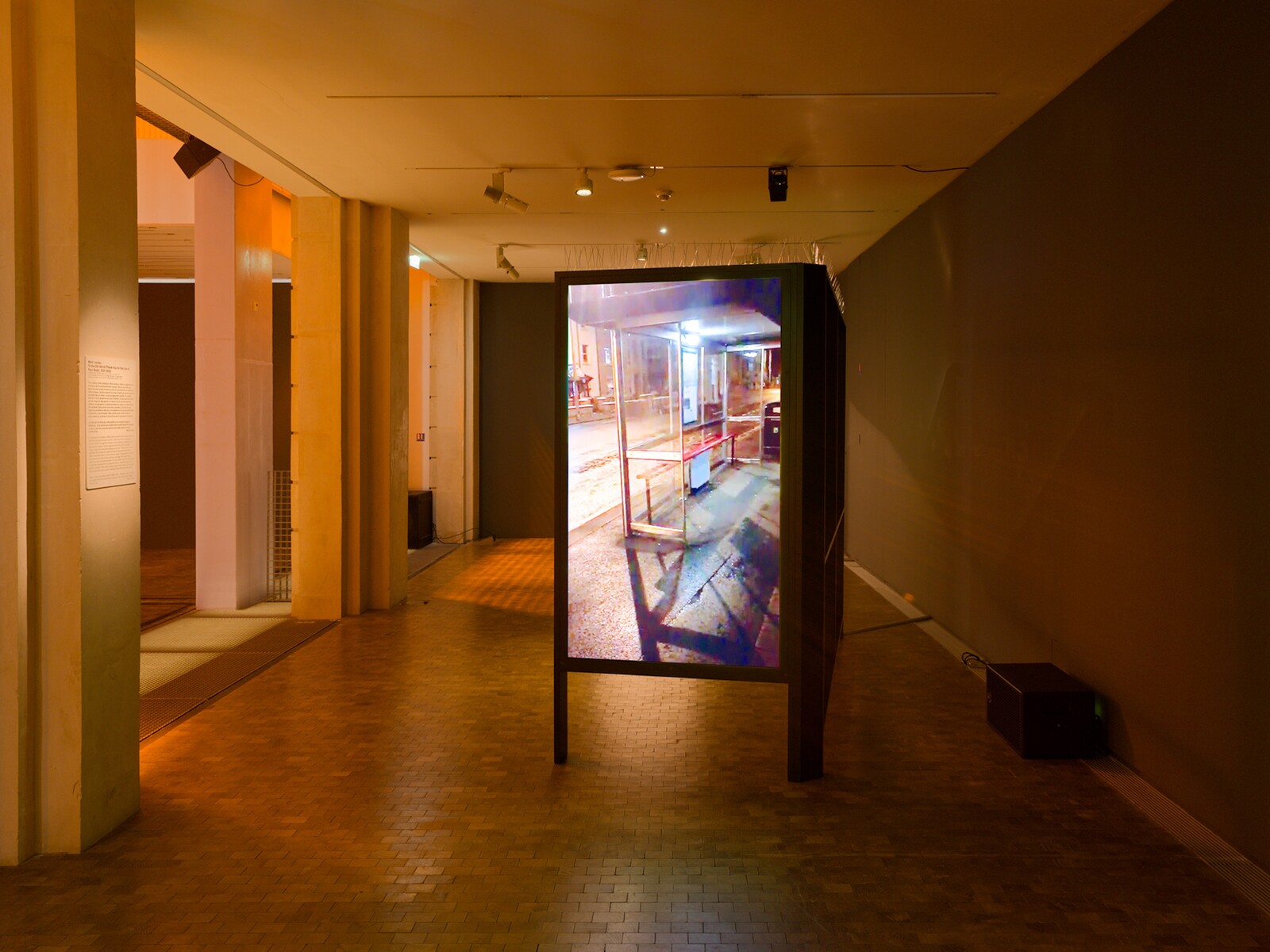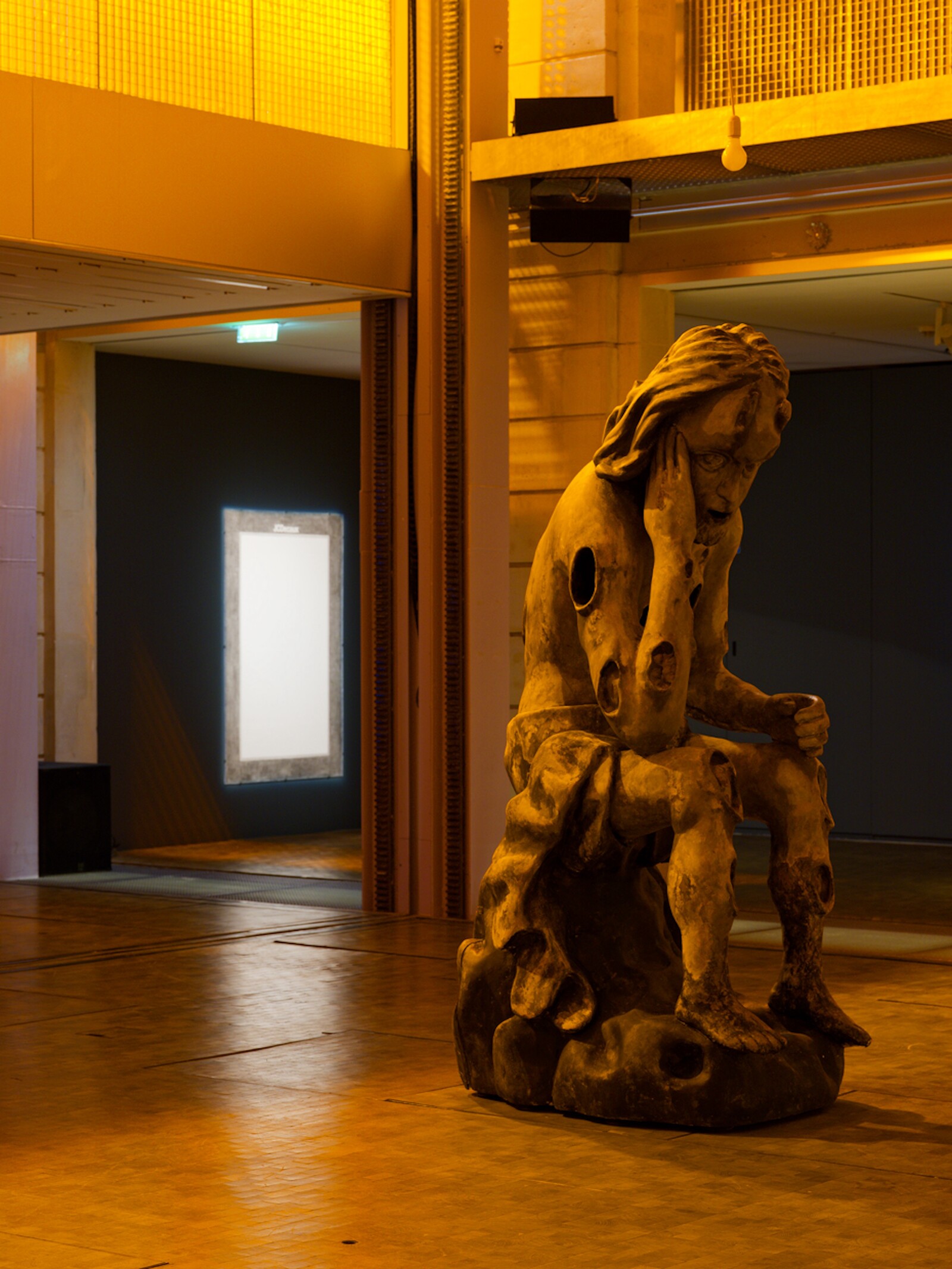 In Lafayette’s central atrium and mezzanine spaces, there is the atmosphere of a dimly lit chapel, one in which icons quietly glimmer before, one after the other, they come to flashing, polyphonic life. At the center of the space is Nobodaddy (2018), a large sculptural figure with gaping ulcers covering his body, who sits with his sorrowful head in his hand.1 Speakers have been installed inside the figure’s lesions, allowing him to act as the MC for the show’s program, sound seeping from his wounds as he announces the title of works before they are activated in the “cloister” areas of the space.2 These include To the Old World (Thank You for the Use of your Body) (2021–22), a replica London bus shelter with a flatscreen monitor where an advertising poster might be. Playing on it is grainy smartphone footage of a young man throwing himself through the glass window panel of a similar bus shelter, presumably for the lolz, which was originally posted on Instagram.