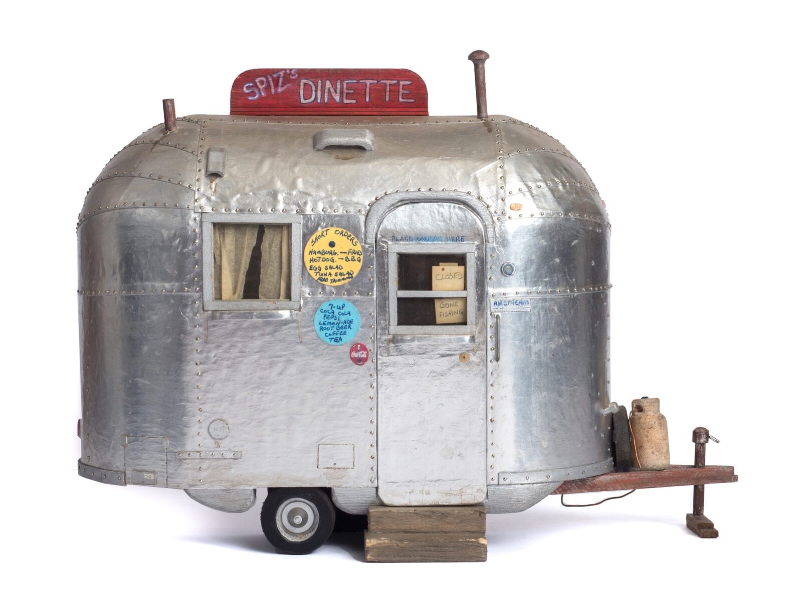 On a formal level, several works note how artists overcome the material limitations inherent to forced captivity. Jesse Krimes’s Apokaluptein 16389067 (2010–13) is a vast fever dream. Hung as a floor-to-ceiling panorama on a curved wall, it consists of heaven, earth, and hell drawn in pencil over newspaper images transferred using hair gel onto 39 bed sheets—each of which were individually smuggled out of jail via the postal system. A low plinth in another chamber hosts Dean Gillispie’s nostalgic maquettes depicting 1950s Americana through miniature airstream trailers, dinners, and gas stations. The airstream’s aluminum shell is made from cigarette packet foil; its rivets are pins clipped from the prison sewing shop, and its curtains used tea-bag paper. In an extended caption, Gillispie—who was exonerated in 2017, after serving from 1991 to 2011—says of the work: “they were procuring my life, and I was procuring products from them.” Like many artists in this show, Gillispie adapts the techniques of the carceral state to propose counter-collections and narratives.