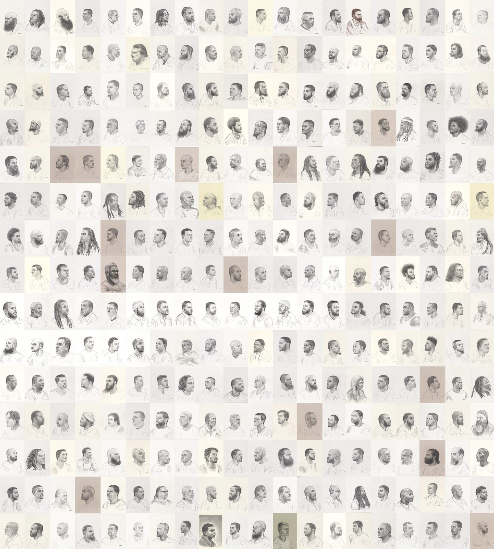 Mark Loughney’s Pyrrhic Defeat: A Visual Study of Mass Incarceration (2014–ongoing) comprises 500 graphite-on-paper portraits of the artist’s fellow inmates. The work could easily be read as an attempt to put a face on those made invisible by the prison system. But it is equally a retort to the ways in which image-making—whether police sketch, mugshot, video surveillance, fingerprinting, DNA test, false witness, or other forensic fantasies—can frame people as objects fit for containerization, or worse. By way of inversion, Krimes’s Purgatory (2009) transfers headshots, both fictive and real, onto bits of prison soap. Hidden in decks of cards that were hollowed out, these contraband images were bootlegged out of solitary confinement—a punishment Krimes endured for refusing to become an informant. Optic regimes are further turned inside out by Larry Cook. In his series The Visiting Room (2019), the artist restages the elaborate painted backdrops in front of which prisoners pose for pictures to send home, complete with everything from the Manhattan skyline to a Lexus parked under a full moon. Cook’s sitters elusively turn their backs, refusing to show their faces. More than simple posturing, these gestures at once demand anonymity against the constant surveillance intrinsic to policing, and reframe each sitter as a reflexive viewer admiring their fellow inmates’ makeshift work.